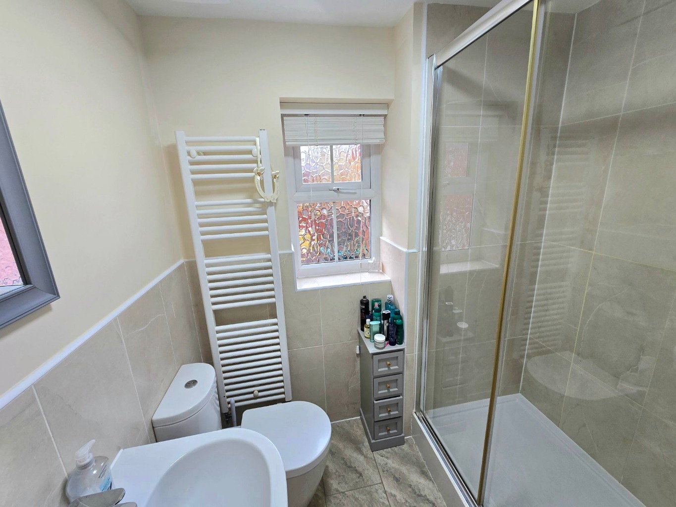 uPVC obscure double glazed window to side elevation. Heated towel rail. Suite comprising WC, wash hand basin and shower cubicle with stainless steel shower head. Tiling to half wall height.