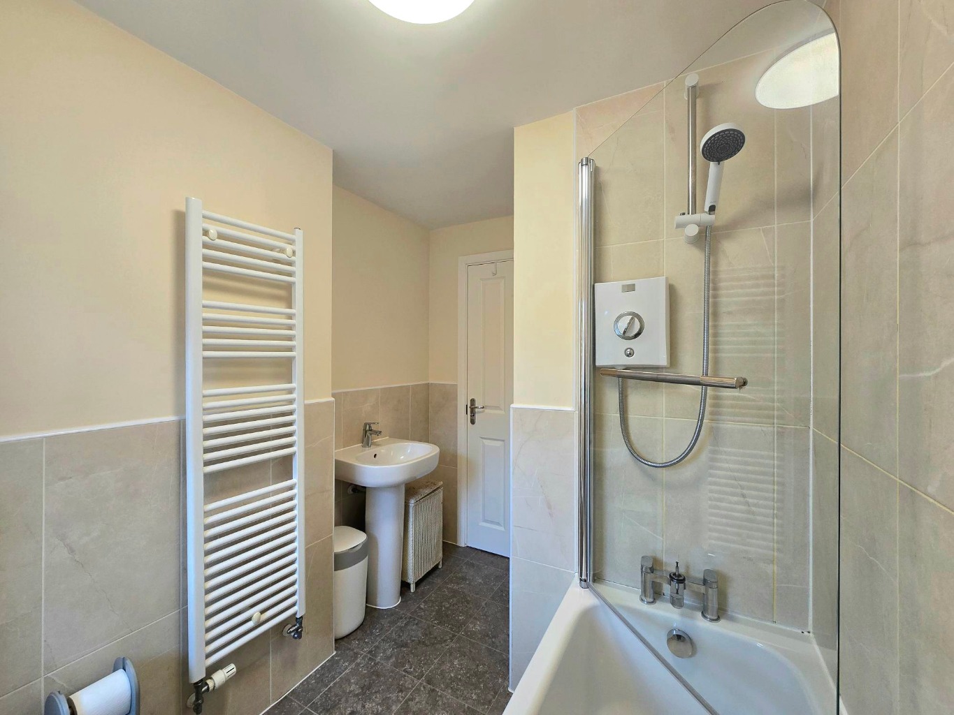 uPVC obscure double glazed window to side elevation. Heated towel rail. Suite comprising WC, wash hand basin with mixer tap over and panelled bath with mixer and shower head over. Tiled walls.