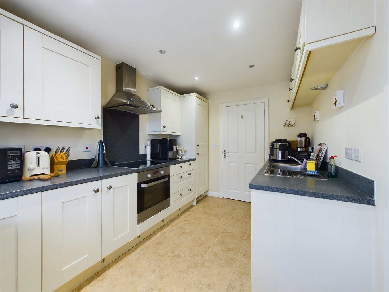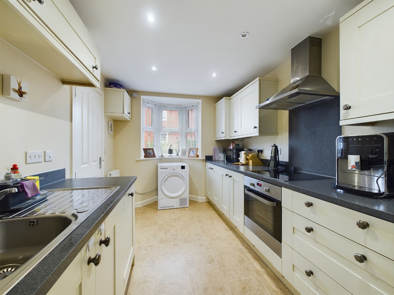 uPVC double glazed bay window to front elevation. Radiator. Fitted with a range of wall, base and drawer units with work surfaces over. Inset sink and drainer unit with mixer tap over. Integrated fridge, freezer, dishwasher and washing machine, Integrated electric oven and induction hob with extractor hood. Spotlights.