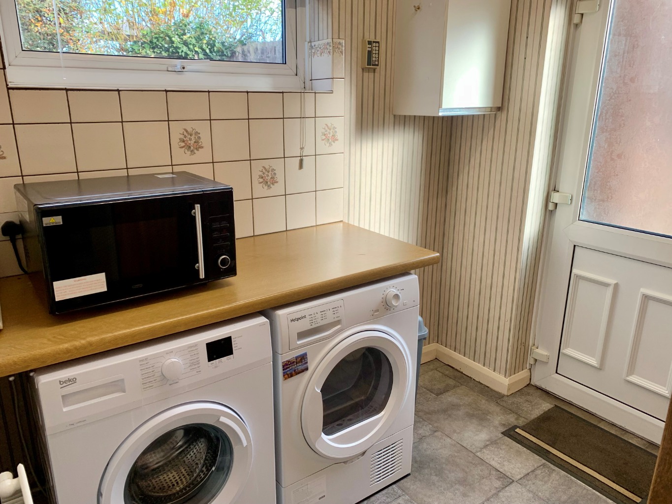 Double glazed window to side elevation and door to rear elevation. Counter top with space for washing machine and tumble dryer. Radiator. Tiled splash back. Tile effect flooring.