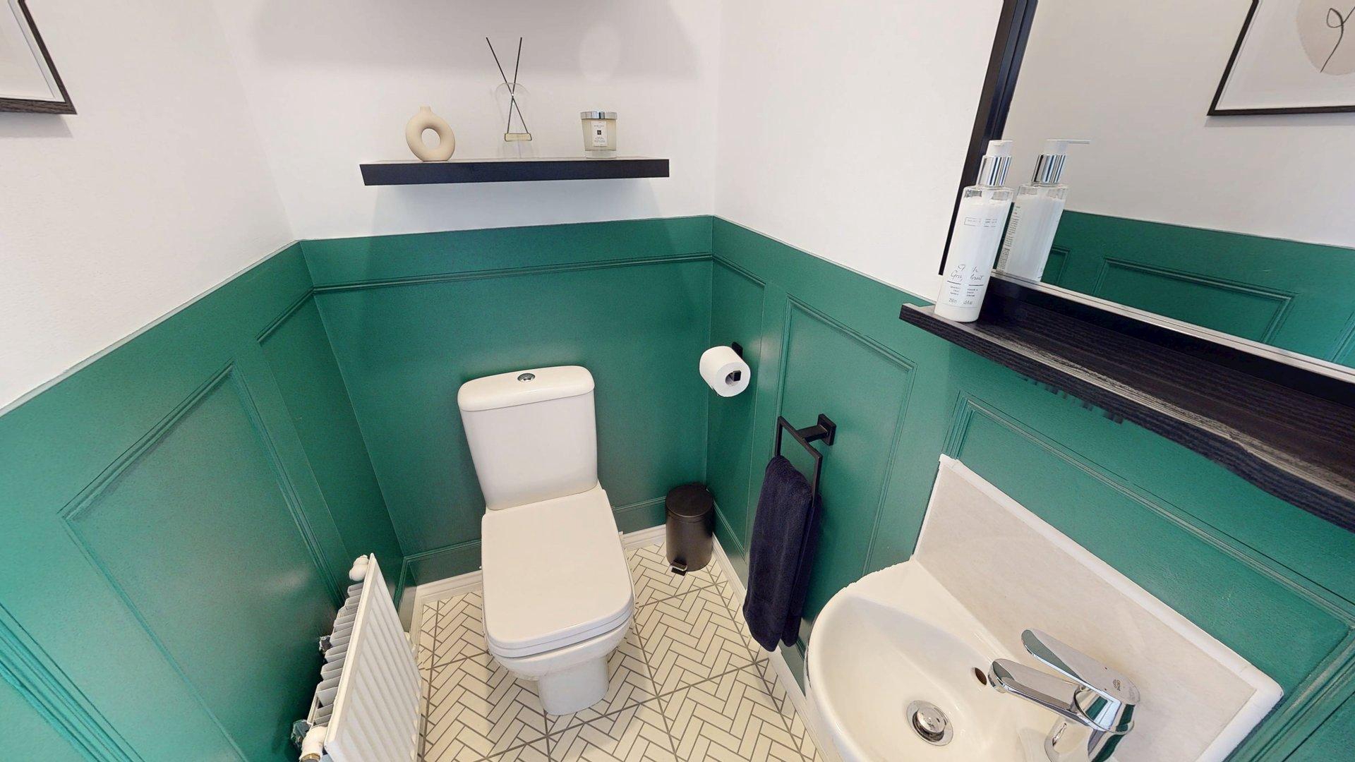 Suite comprising pedestal wash hand basin with mixer tap and low level WC. Radiator. Tile effect flooring. Half wall panelling.