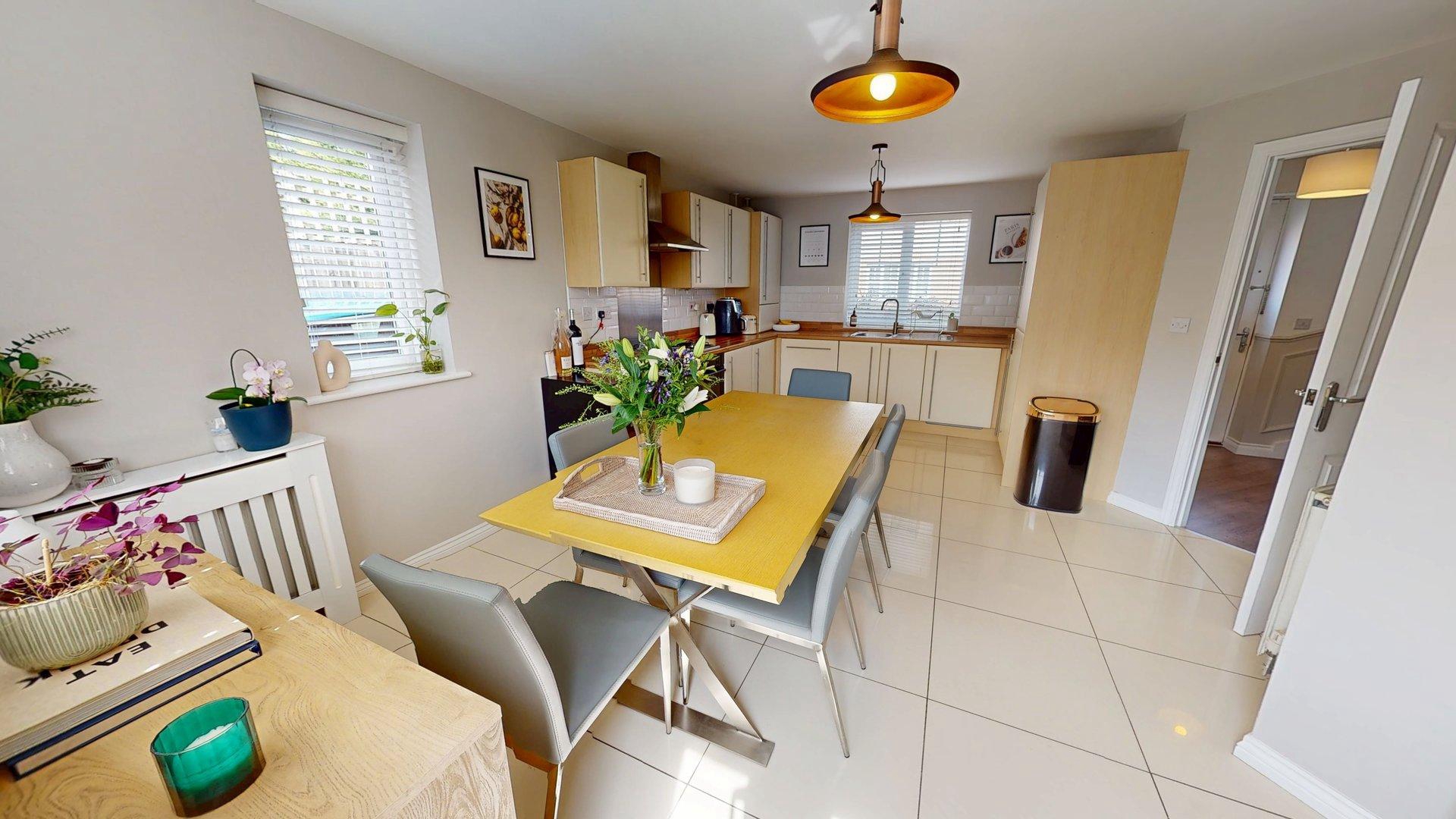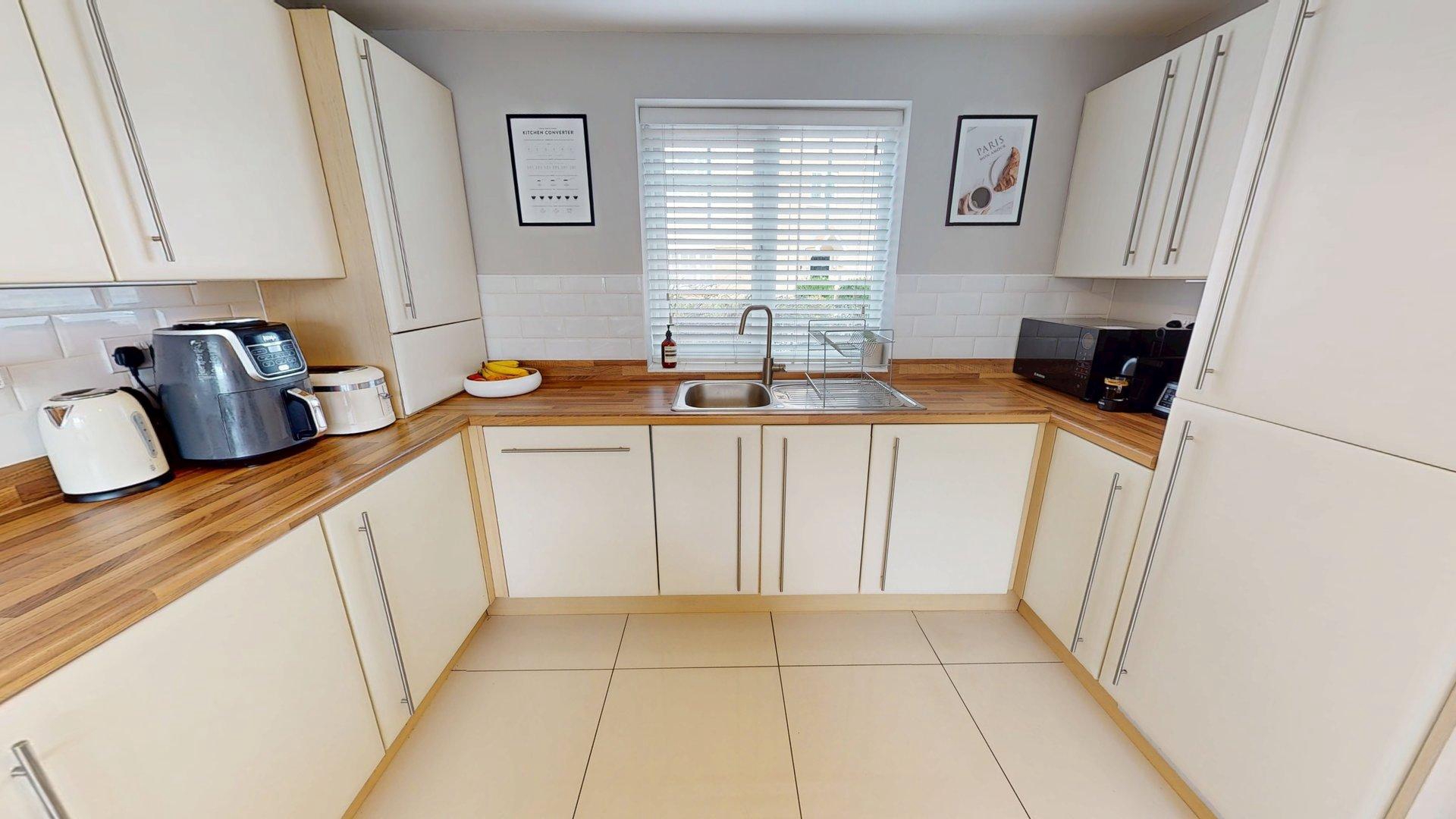 uPVC double glazed windows to front and side elevations. Window and door to rear elevation. Wall and base units. Stainless steel sink with mixer tap. Gas hob and oven with extractor. Integrated dishwasher, fridge/freezer and washing machine. Gloss tiled floor. Two radiators.