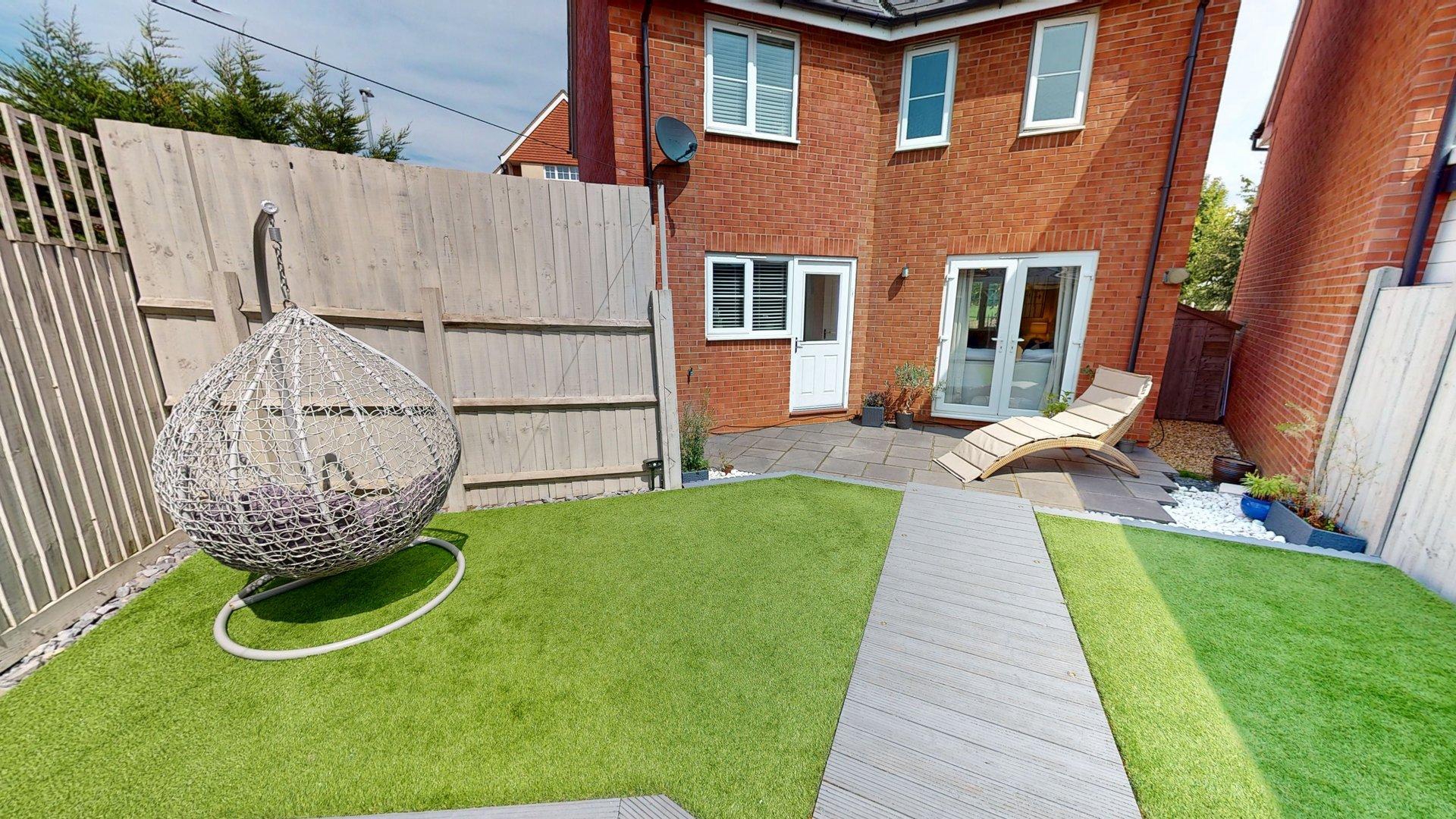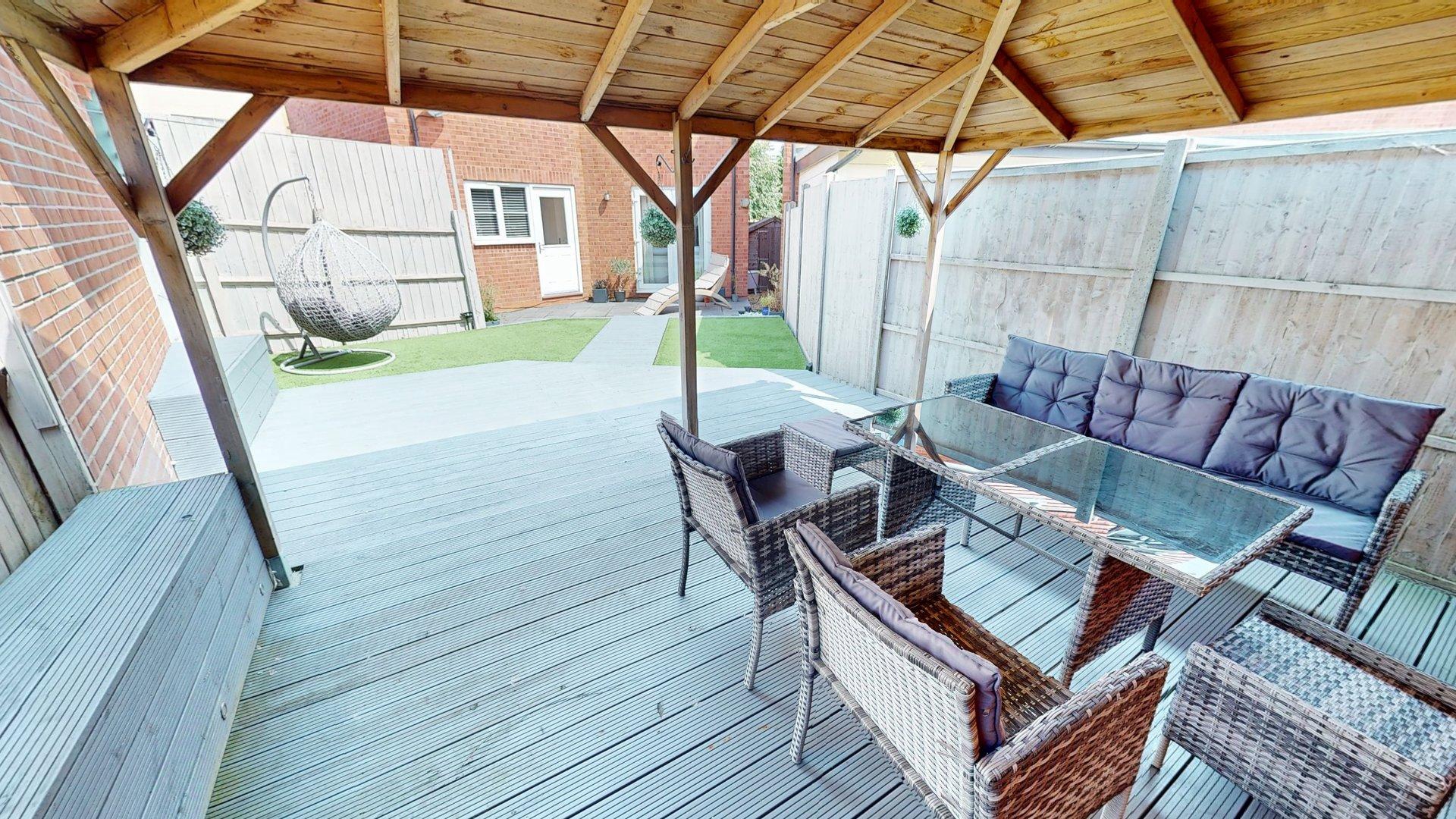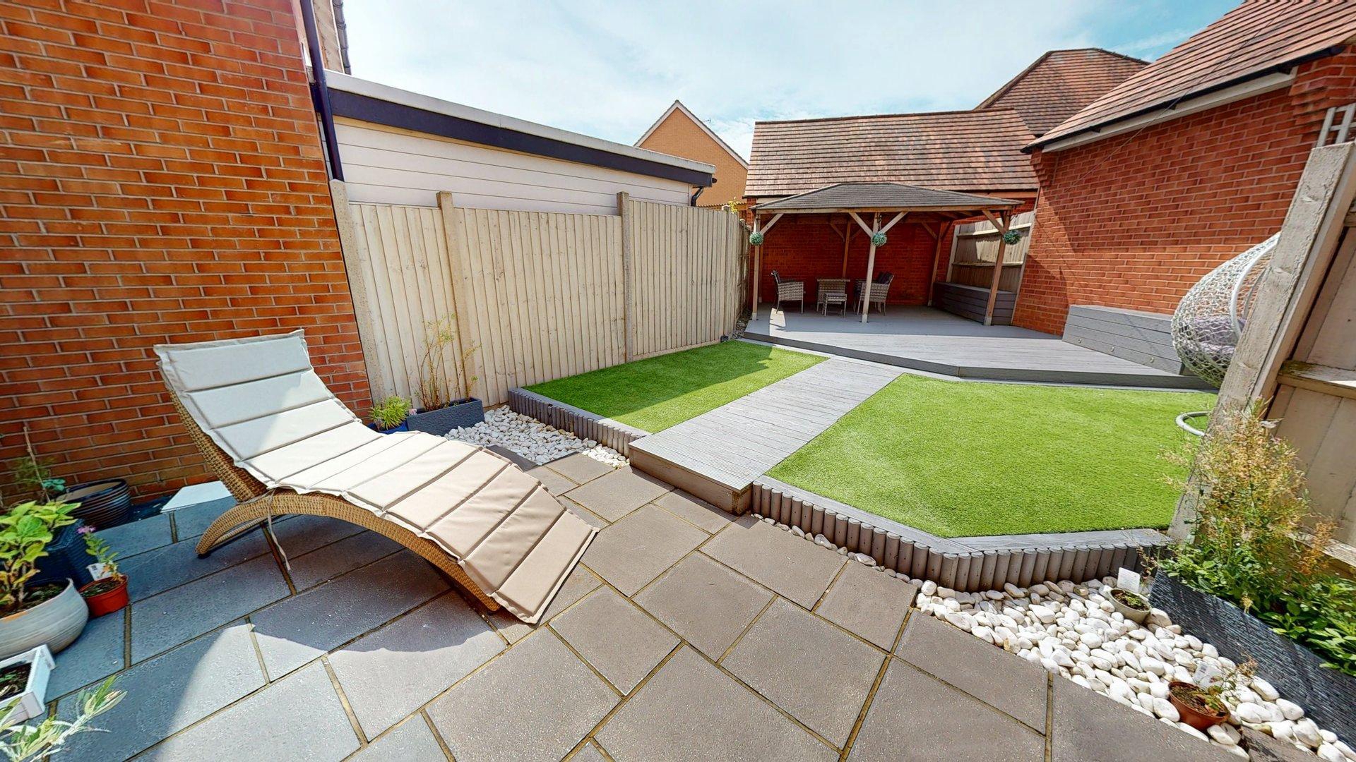 Enclosed by panelled fencing. Side gate. Patio. Decorative stone borders. Artificial lawn. Path to rear. Gazebo at the rear. Side storage with shed.