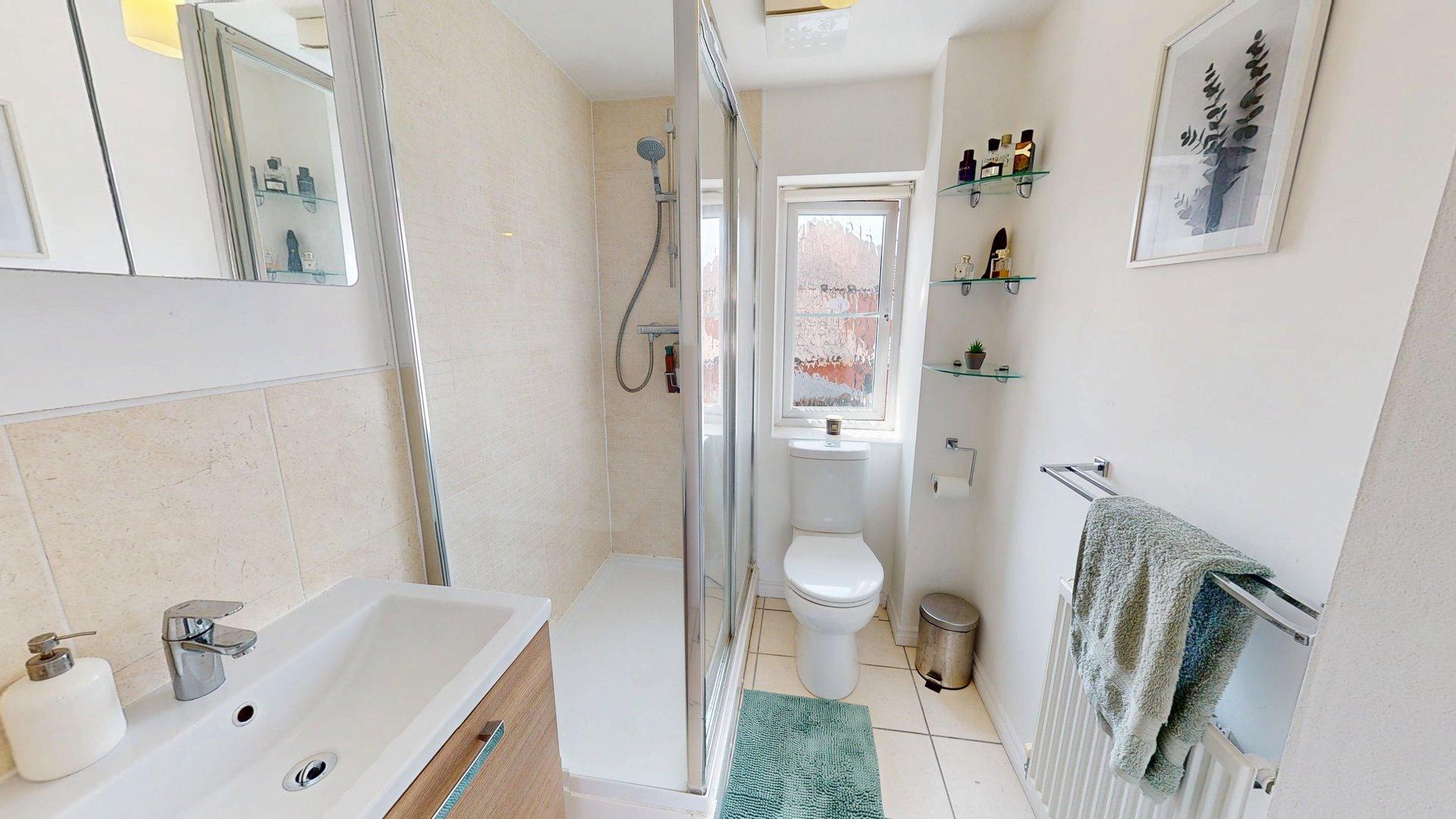 Obscure uPVC double glazed window to rear elevation. Radiator. Suite comprising WC, wash hand basin in vanity unit and shower cubicle. Tiling to splash back areas. Tiled floor. Extractor.
