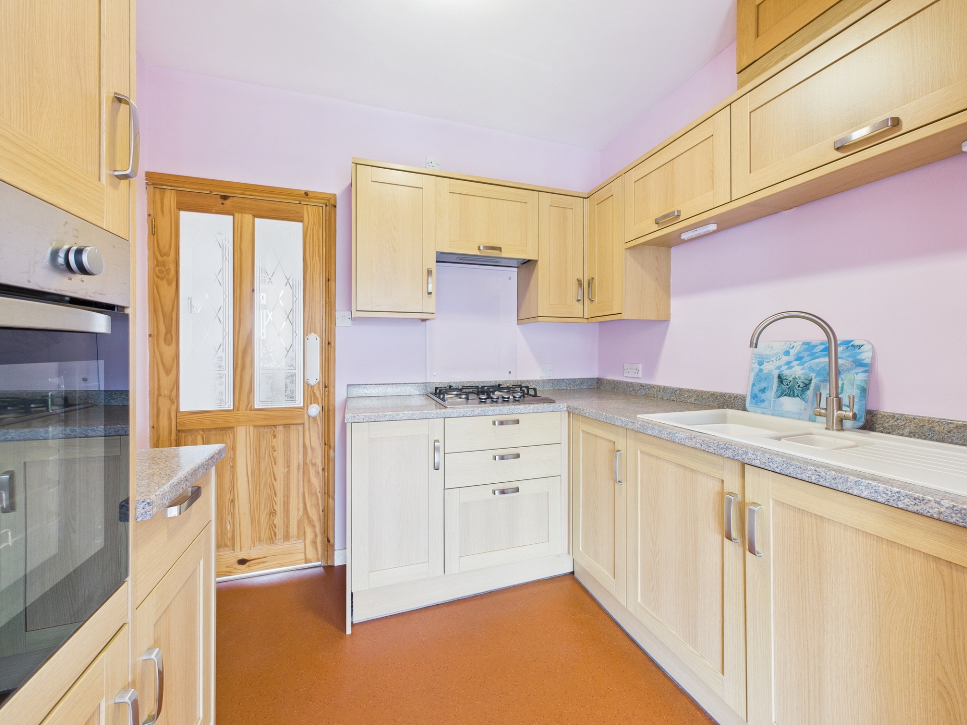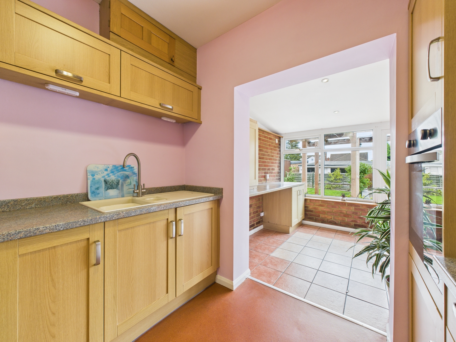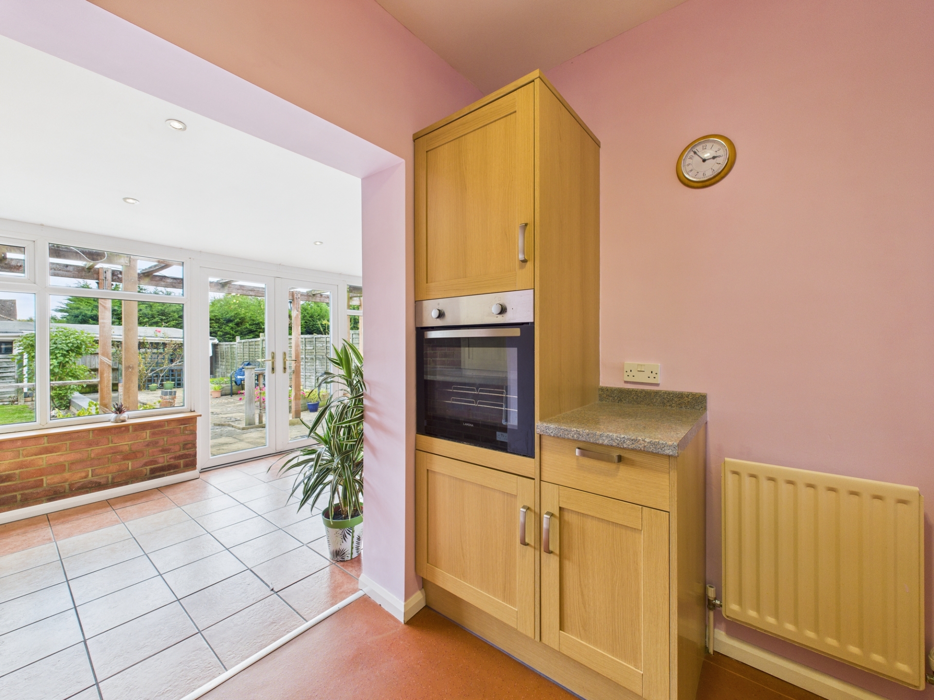 A range of wall and base units. Roll top work surfaces. Integrated cooking appliances. Radiator. Opening into the conservatory.
