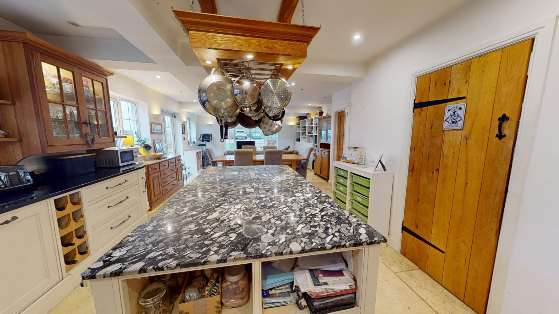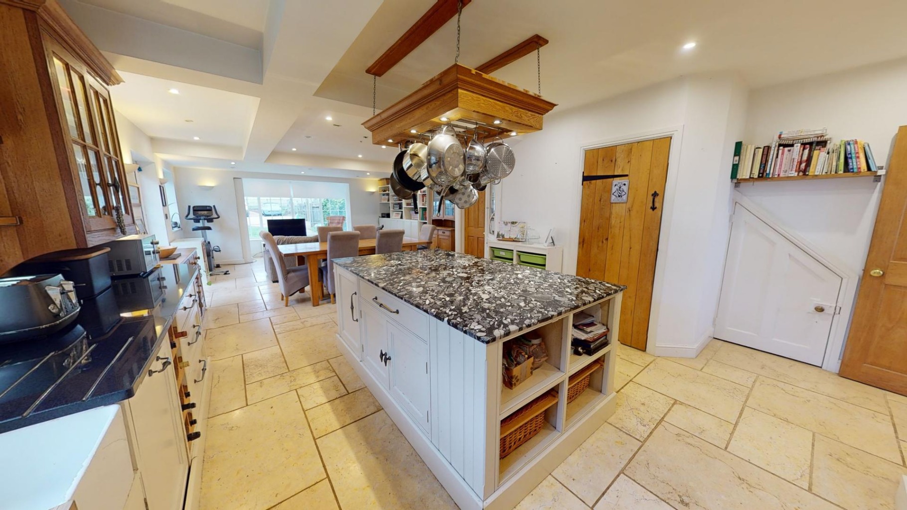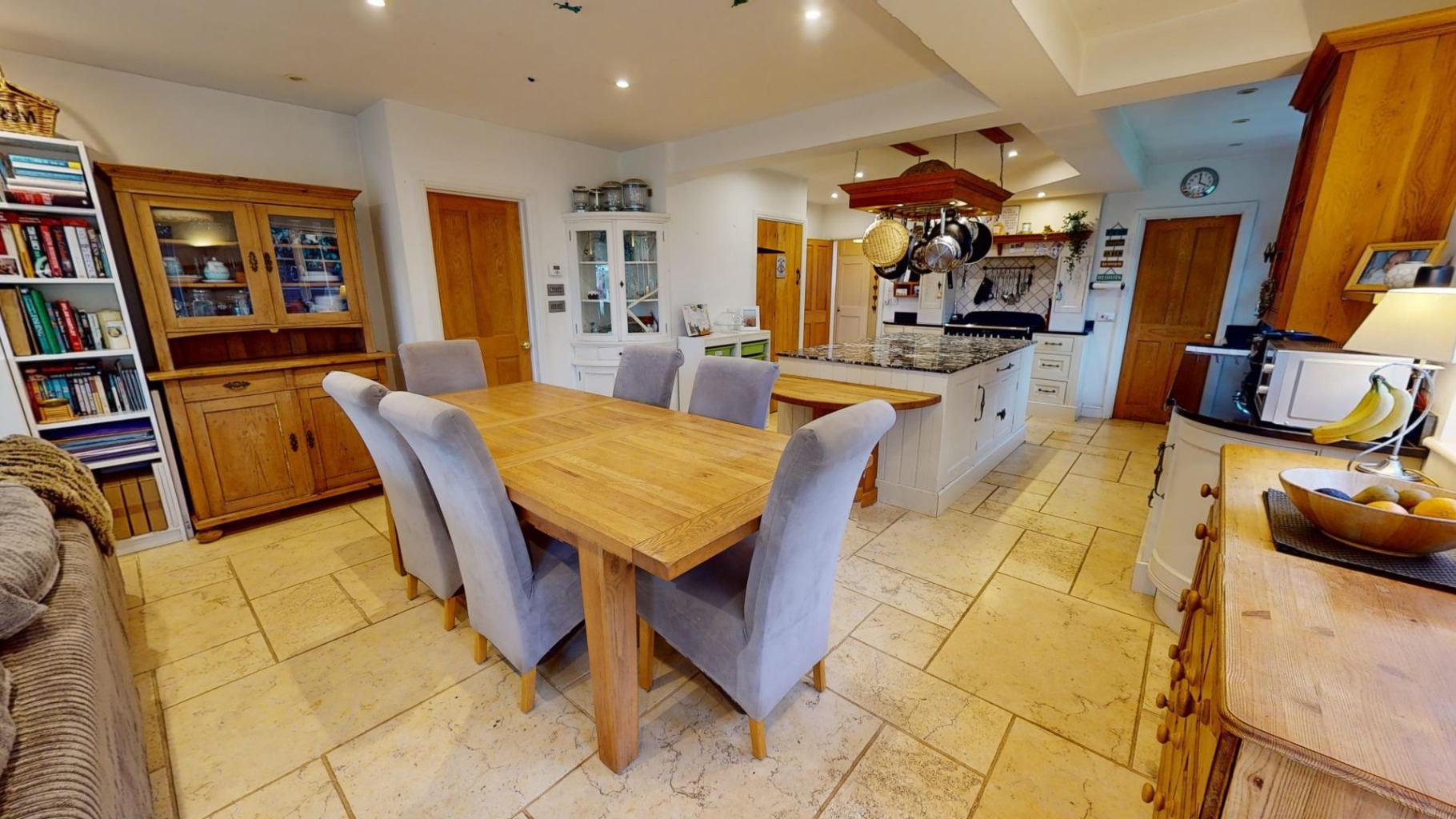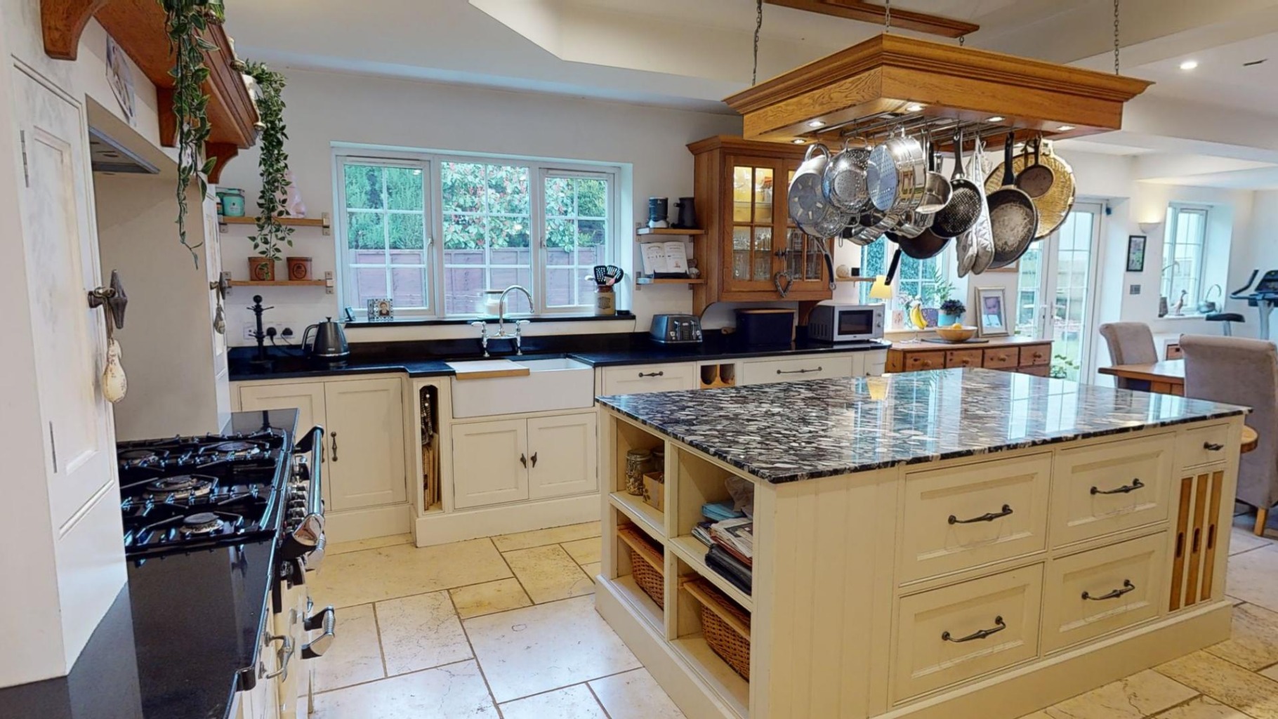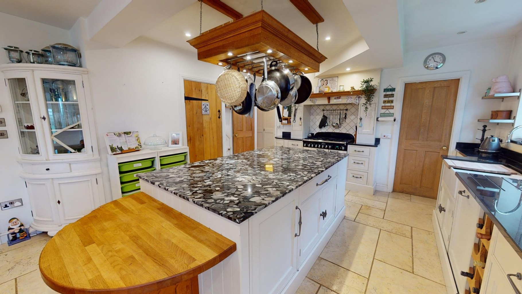 uPVC double glazed window to front elevation. Space for washing machine and tumble dryer. Belfast style sink. Tiling to splash back areas. Tiled floor. Wall units. Granite work surfaces. Spotlights. Understairs cupboard. Under floor heating.