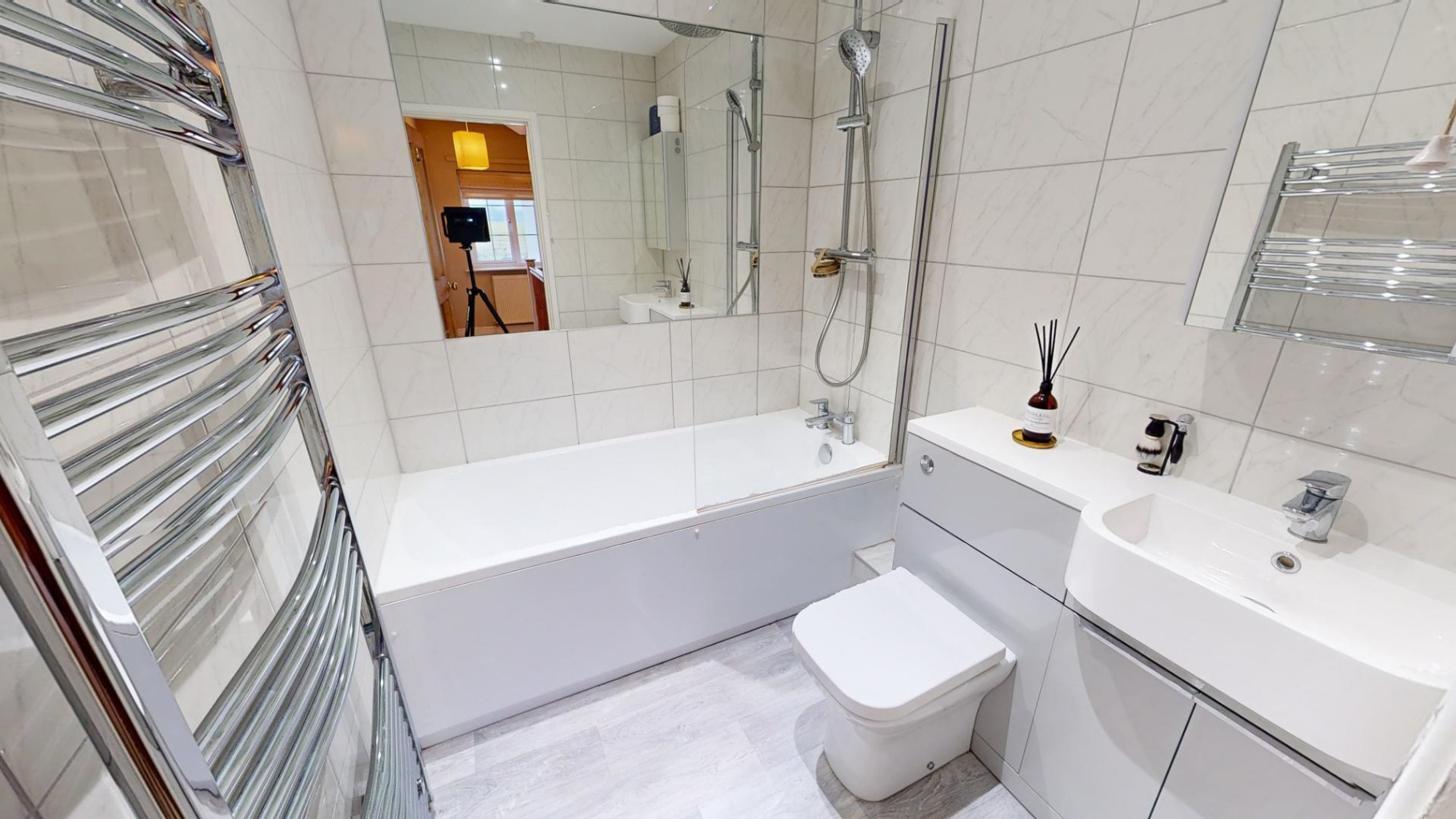 Heated towel rail. Suite comprising panelled bath with mixer tap and shower over, WC and wash hand basin in vanity unit. Extractor. Tiling to splash back areas. Wood effect flooring.