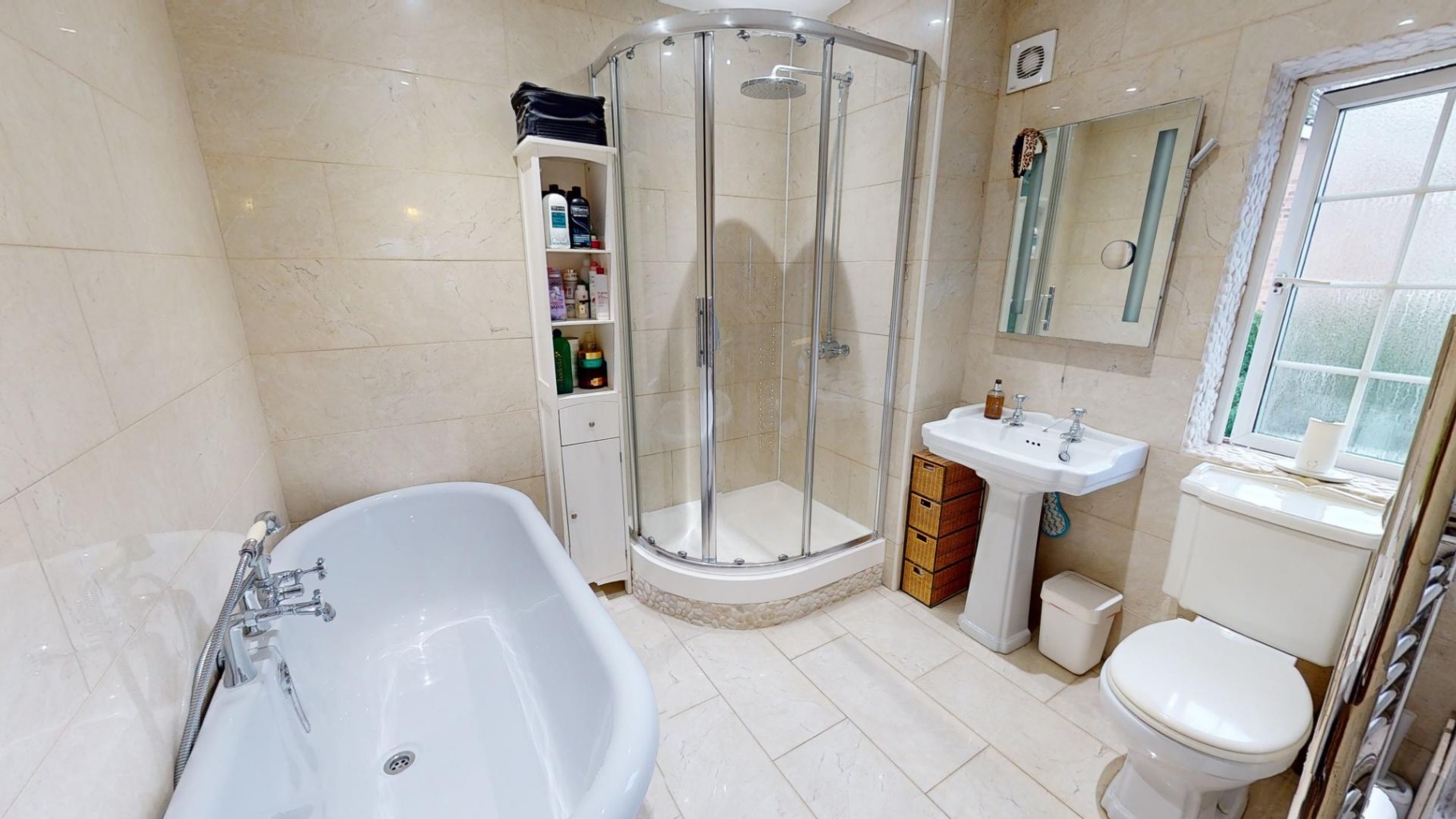 uPVC double glazed window to side elevation. Heated towel rail. Suite comprising pedestal wash hand basin, WC, roll top bath with mixer tap and shower attachment and corner shower cubicle with sliding doors. Fully tiled. Extractor. Spotlights.