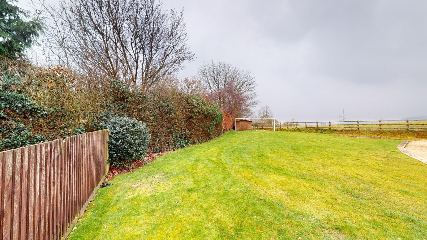 Hedging to side. Lawn. Space for shed. Covered area with spotlights.