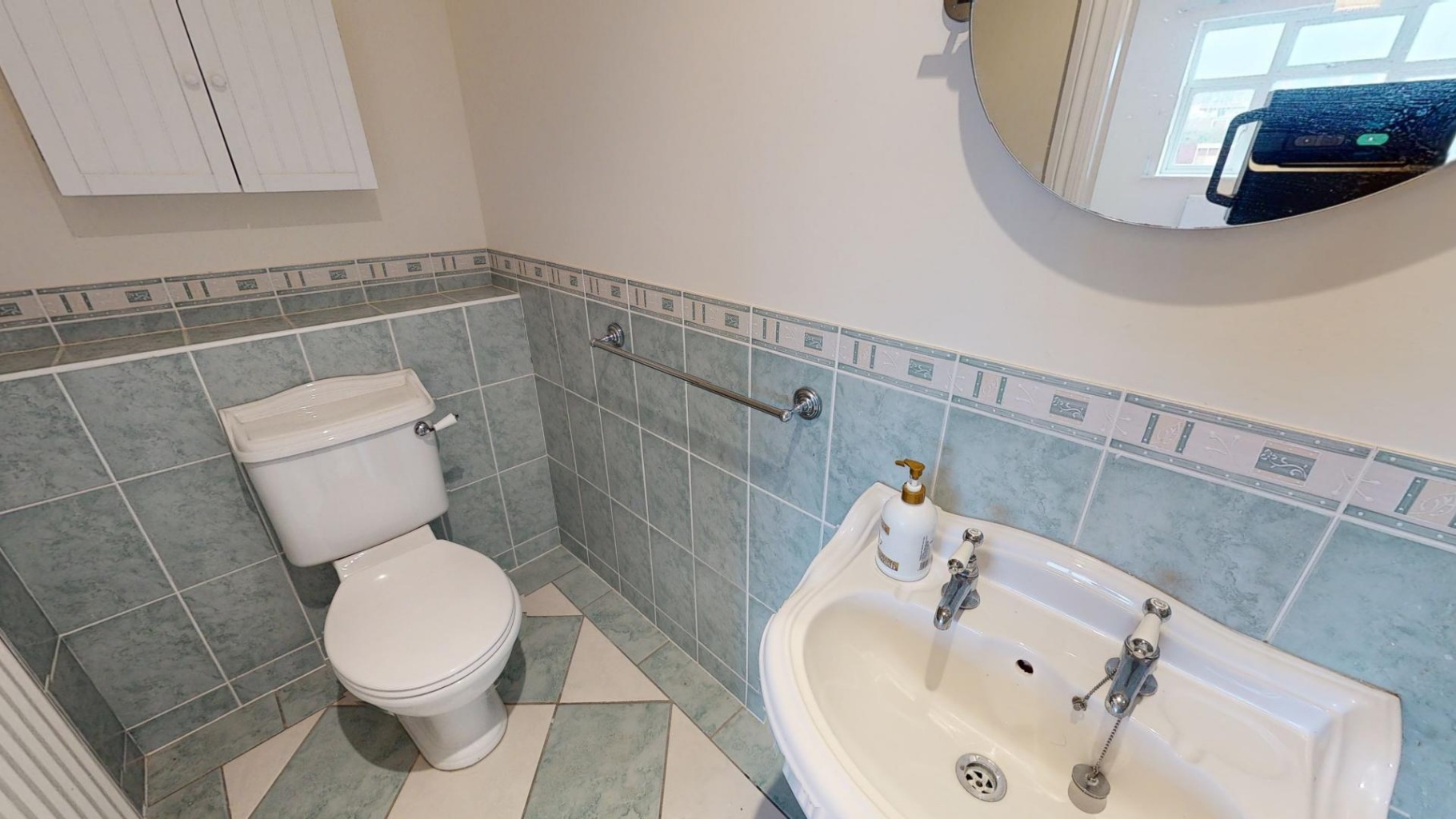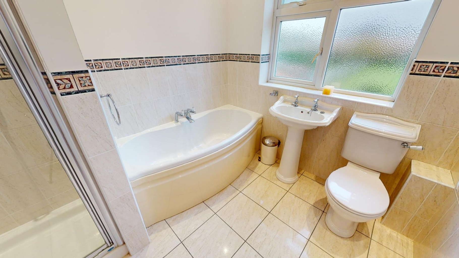 Heated towel rail. Suite comprising pedestal wash hand basin and WC. Tiled floor. Half tiled splash backs. Extractor.
