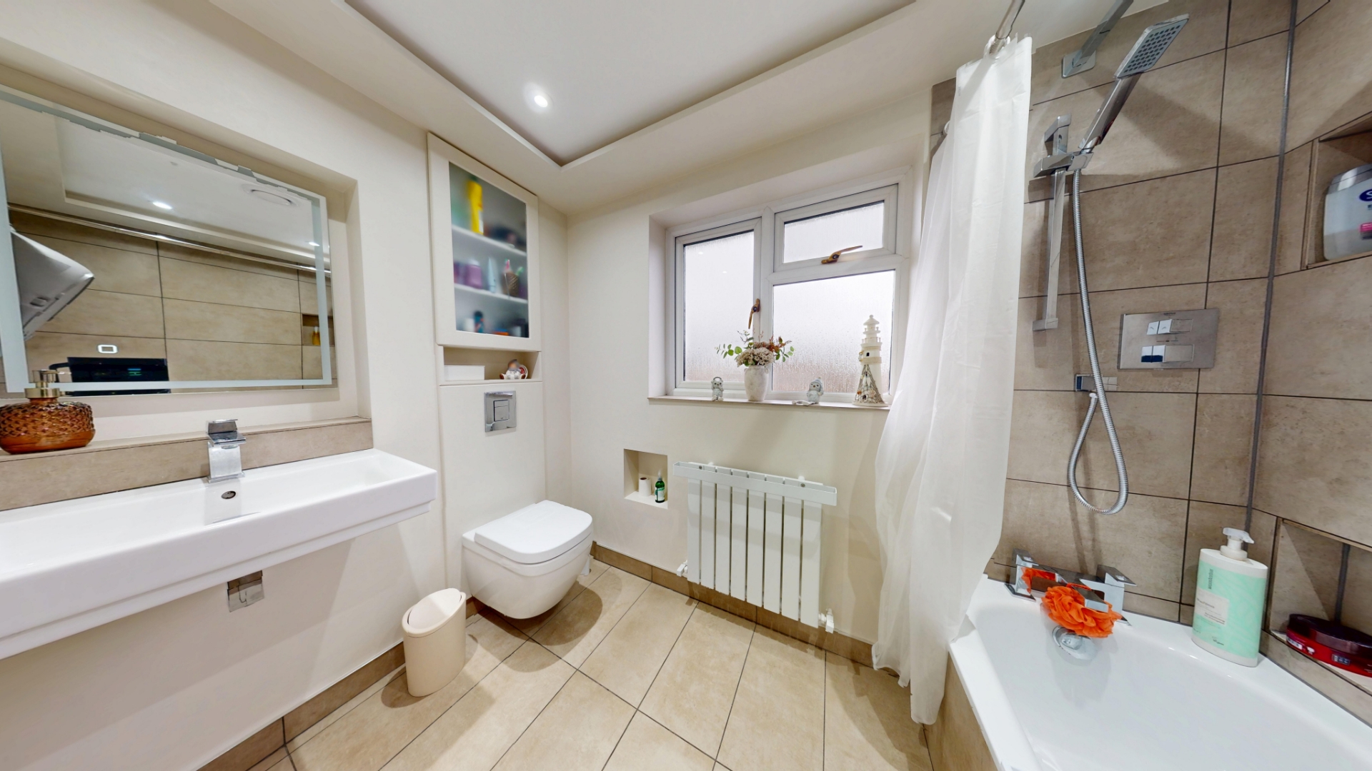 Double glazed obscure glazed window to rear elevation. Refitted three piece suite comprising bath with mixer tap and shower over with rainwater shower head and additional shower head, wash hand basin with mixer tap and WC. Shaver point. Part tiled walls with ceiling and recess light. Tiled floor. Inset ceiling lights. Built in shelved cupboard.