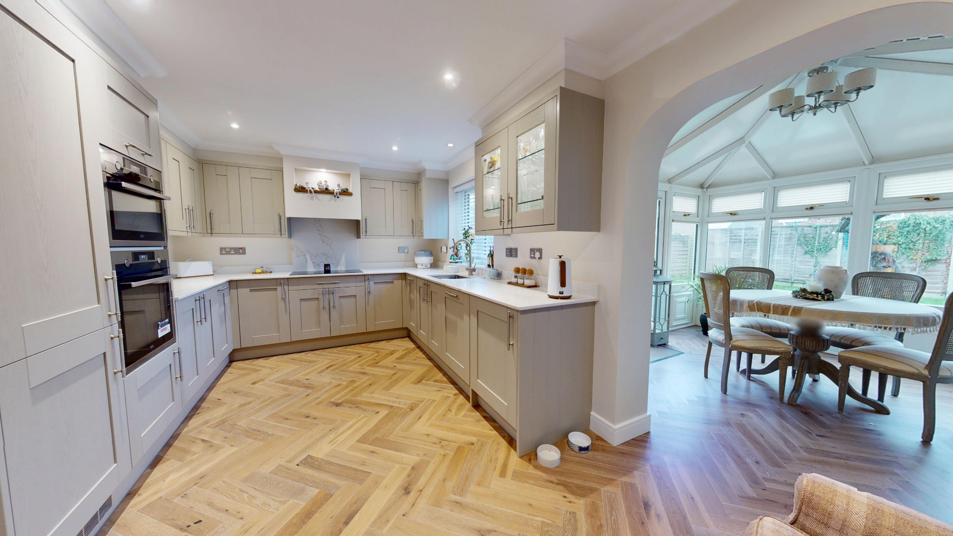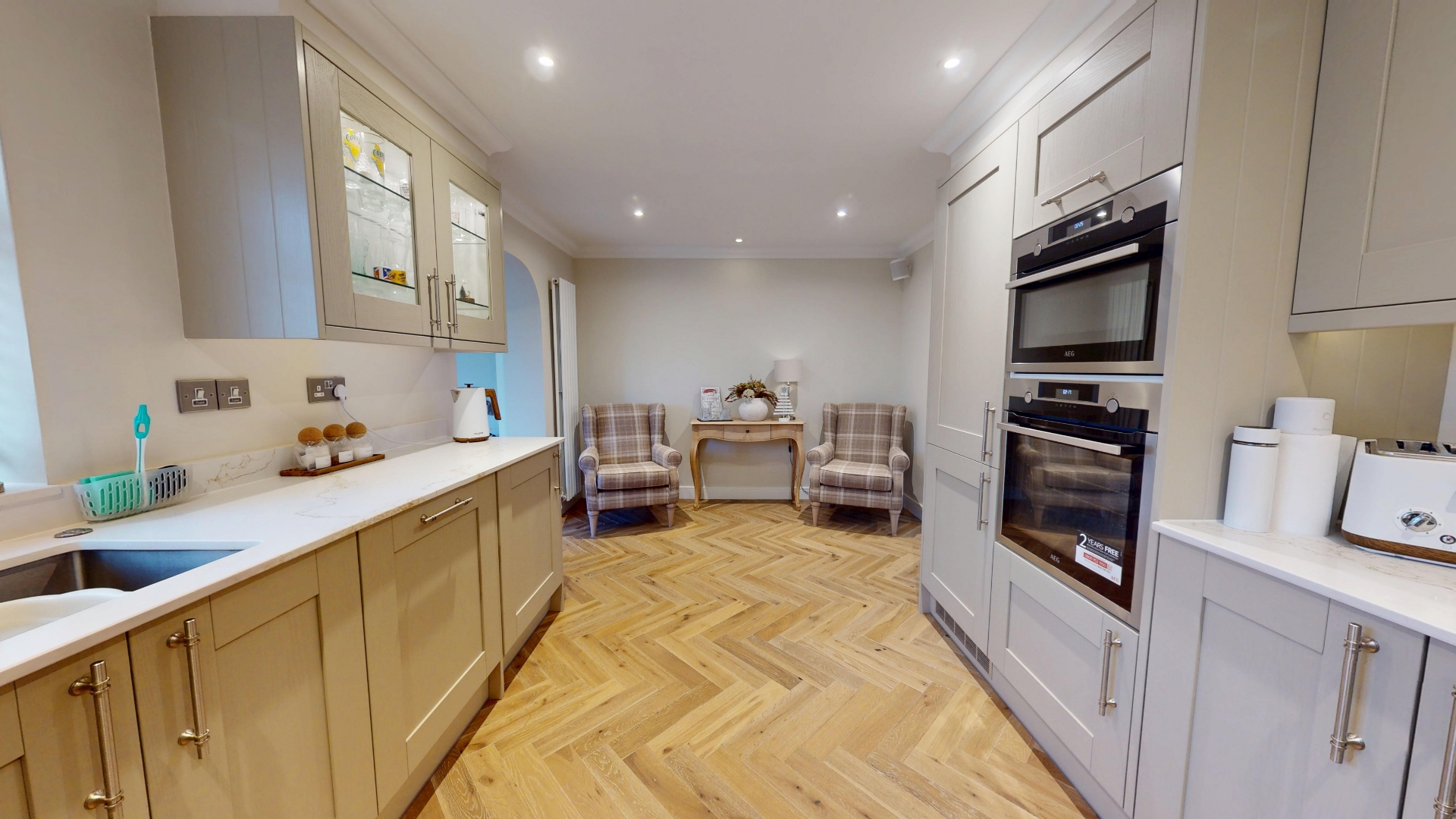 Double glazed window to rear elevation. Engineered wood flooring. Refitted wall and base units with solid Quartz work tops. Built in high level electric ovens, electric induction hob with AEG cooker hood, dishwasher, washing machine and larder style fridge. Quartz splash backs. Inset ceiling lights. Coving. Display unit. Sink with filter mixer tap. Archway to: