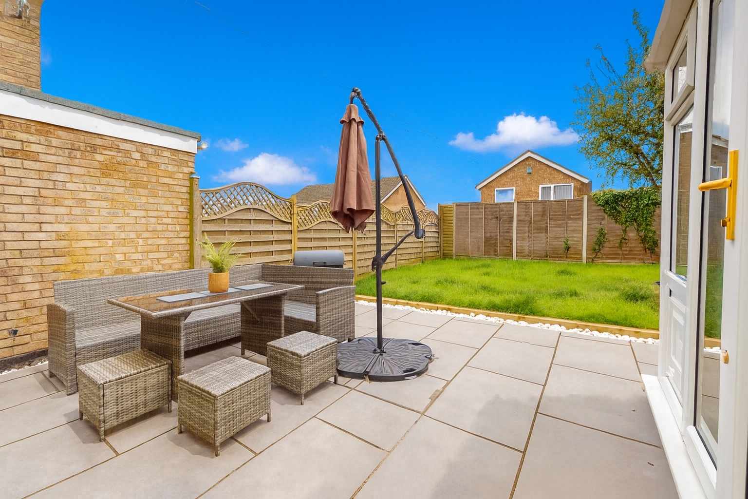 Enclosed by fencing. Paved patio area. Lawned garden with Blossom tree. Hot and cold outside taps and electrics. Timber shed with power and light.