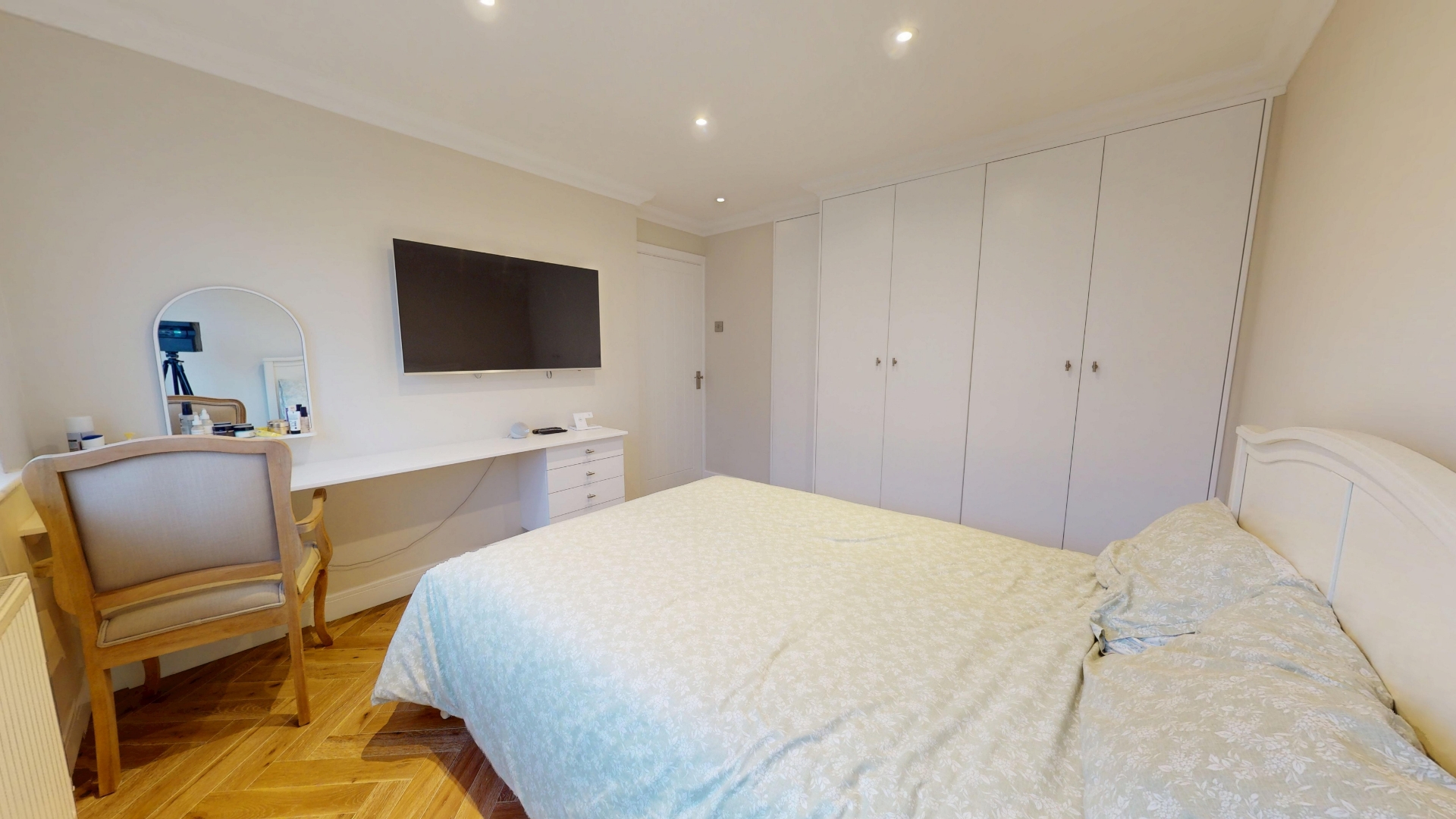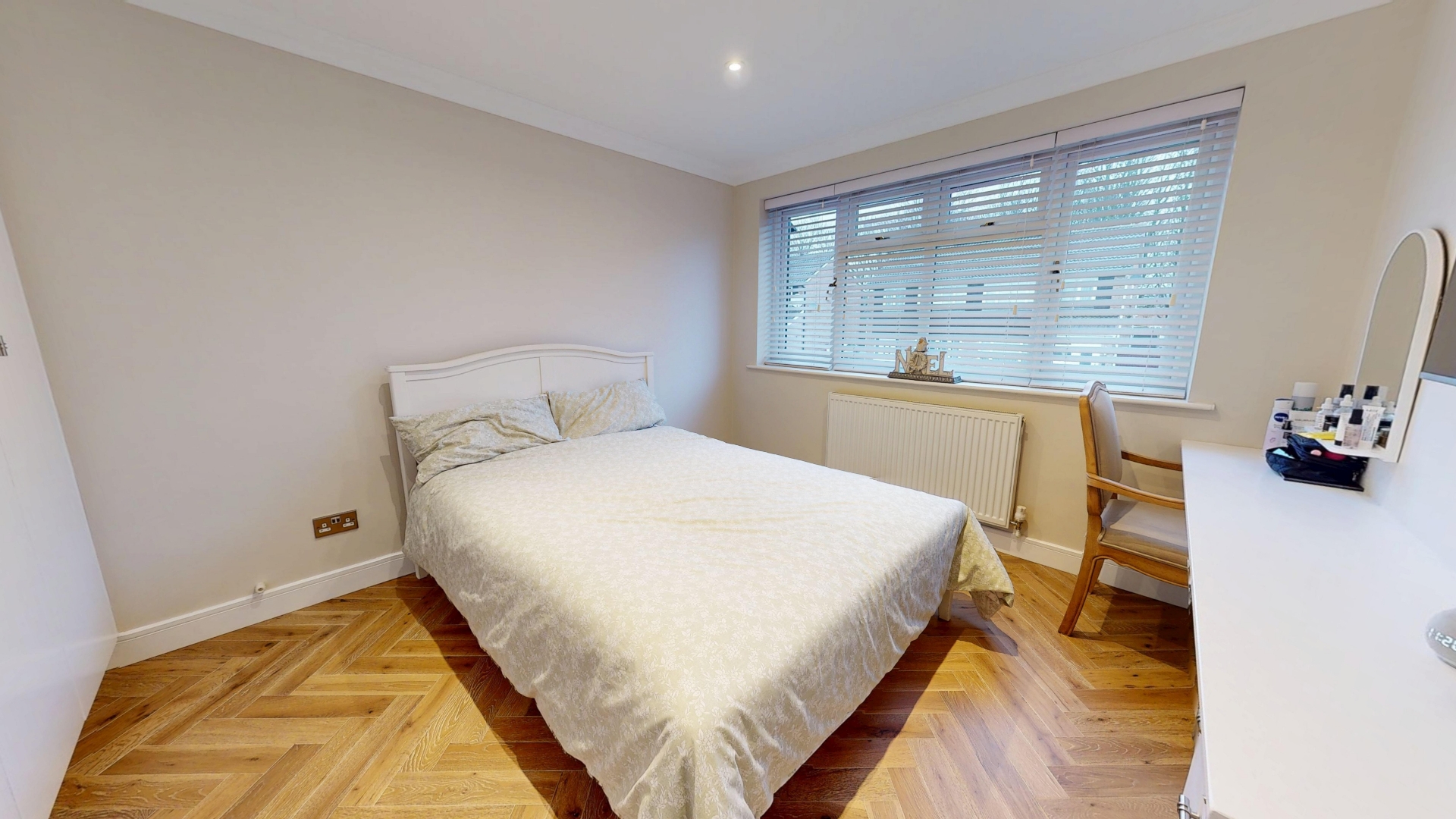 Double glazed window to front elevation. Radiator. Fitted wardrobes and dressing table with drawers. Engineered wood flooring. Coving. Inset ceiling lights.
