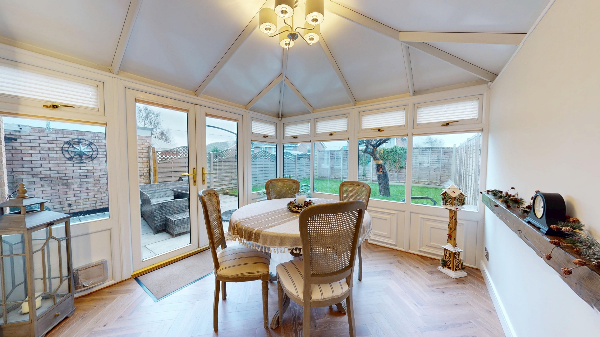 Solid roof. Double glazed French doors to side elevation. Double glazed windows to side and rear elevations. Radiator. Built in display unit with lighting. Engineered wood floor.