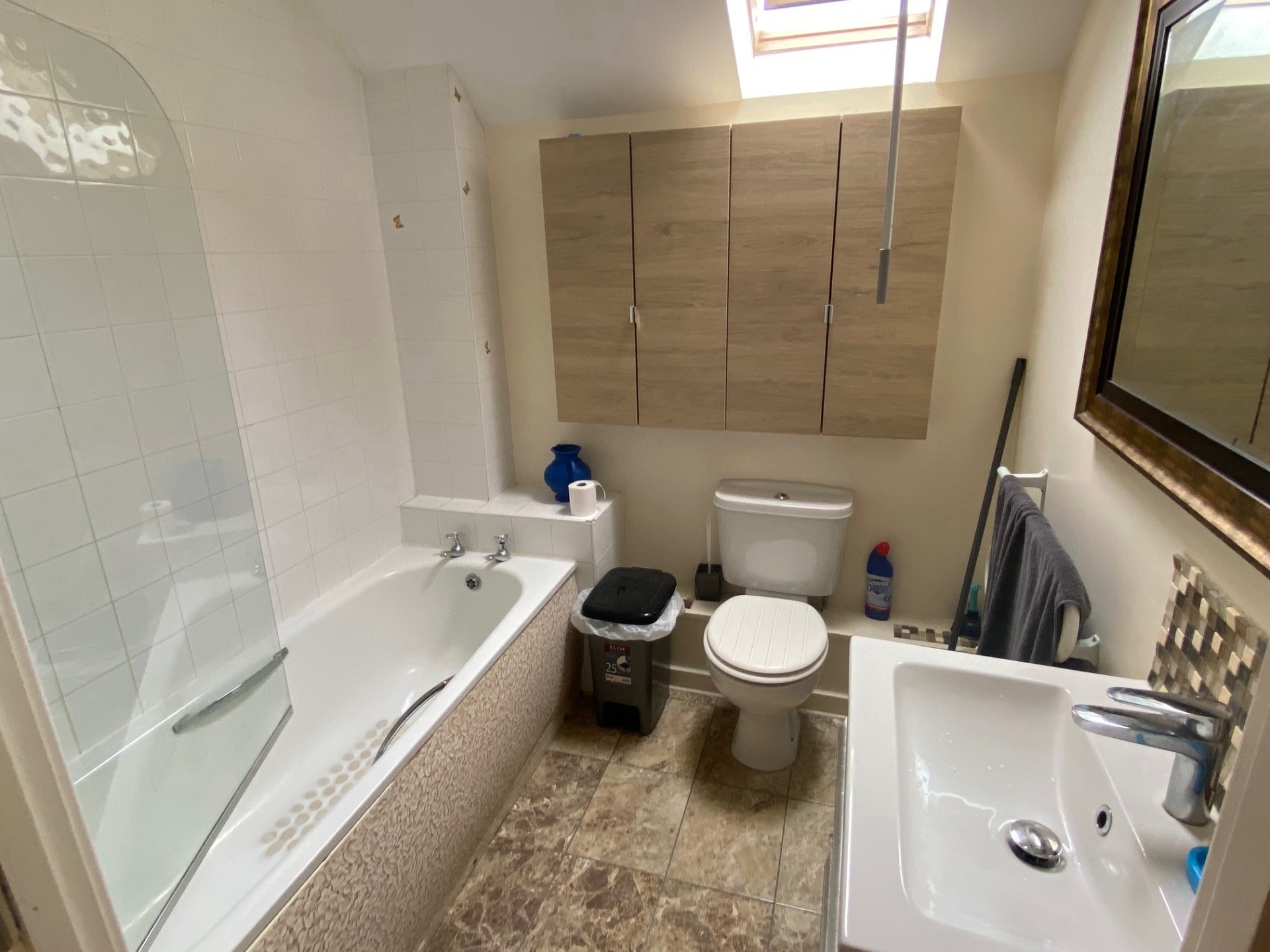 Velux window. Panel bath with shower over. Low level WC. Wash hand basin in vanity unit. Tiled floor.