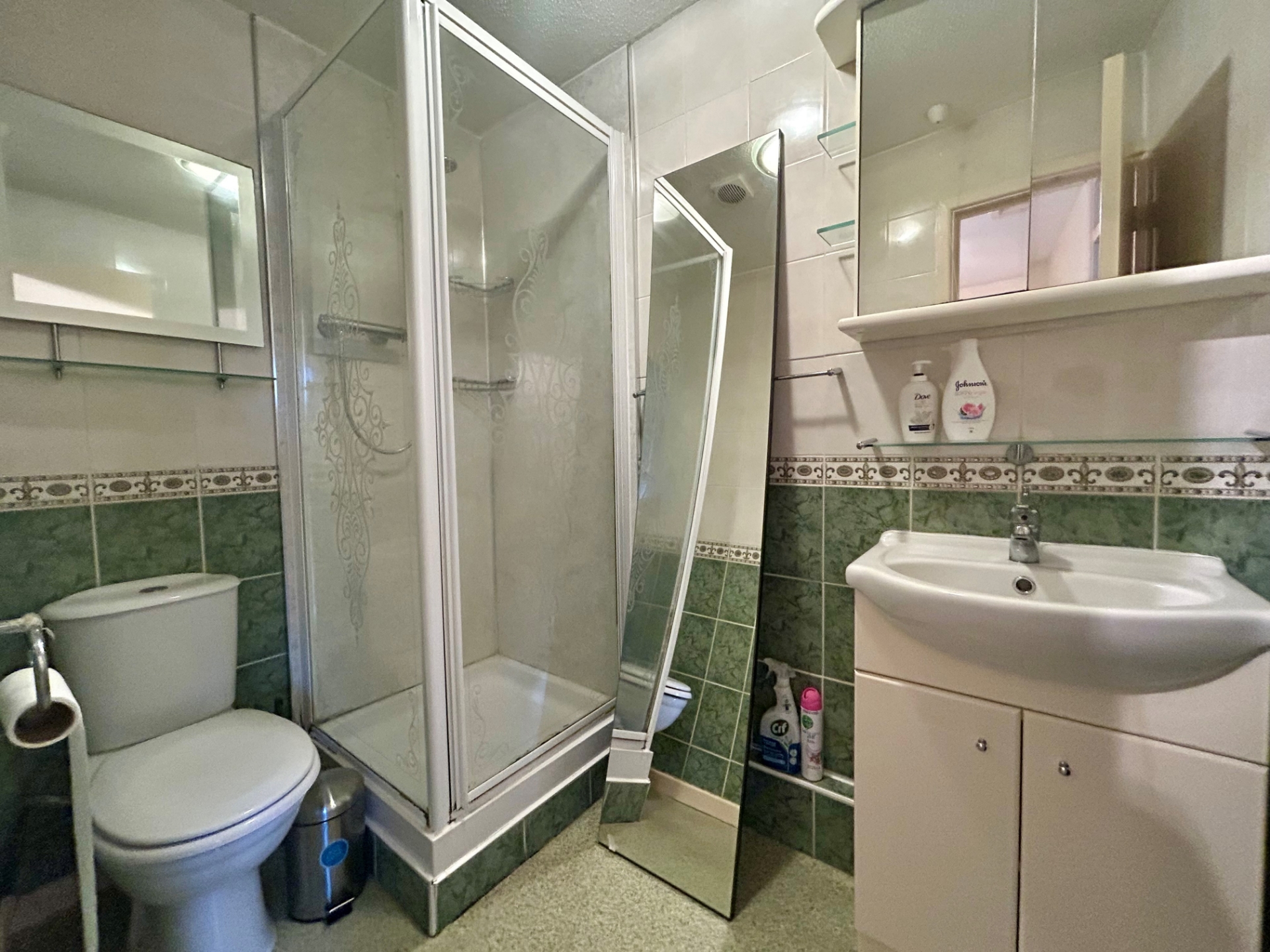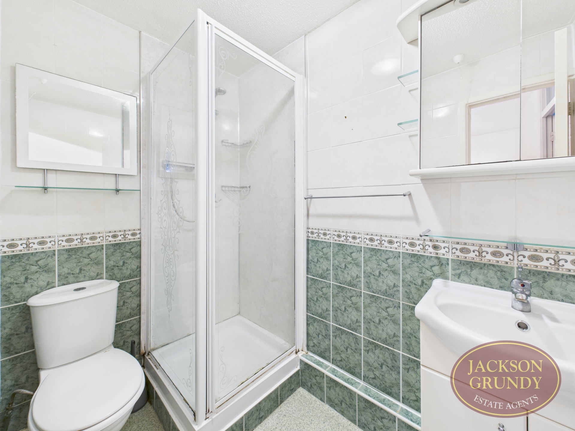 Wash hand basin. Shower cubicle. Vinyl flooring. Low level WC. Radiator.