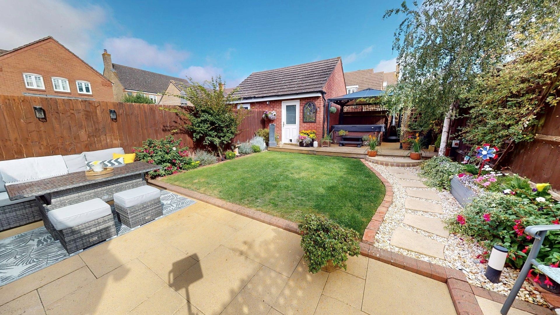 Enclosed by panelled fencing. Patio and path to rear seating area. Central lawn. Side planting. Side access to front. Decking. Door to garage.