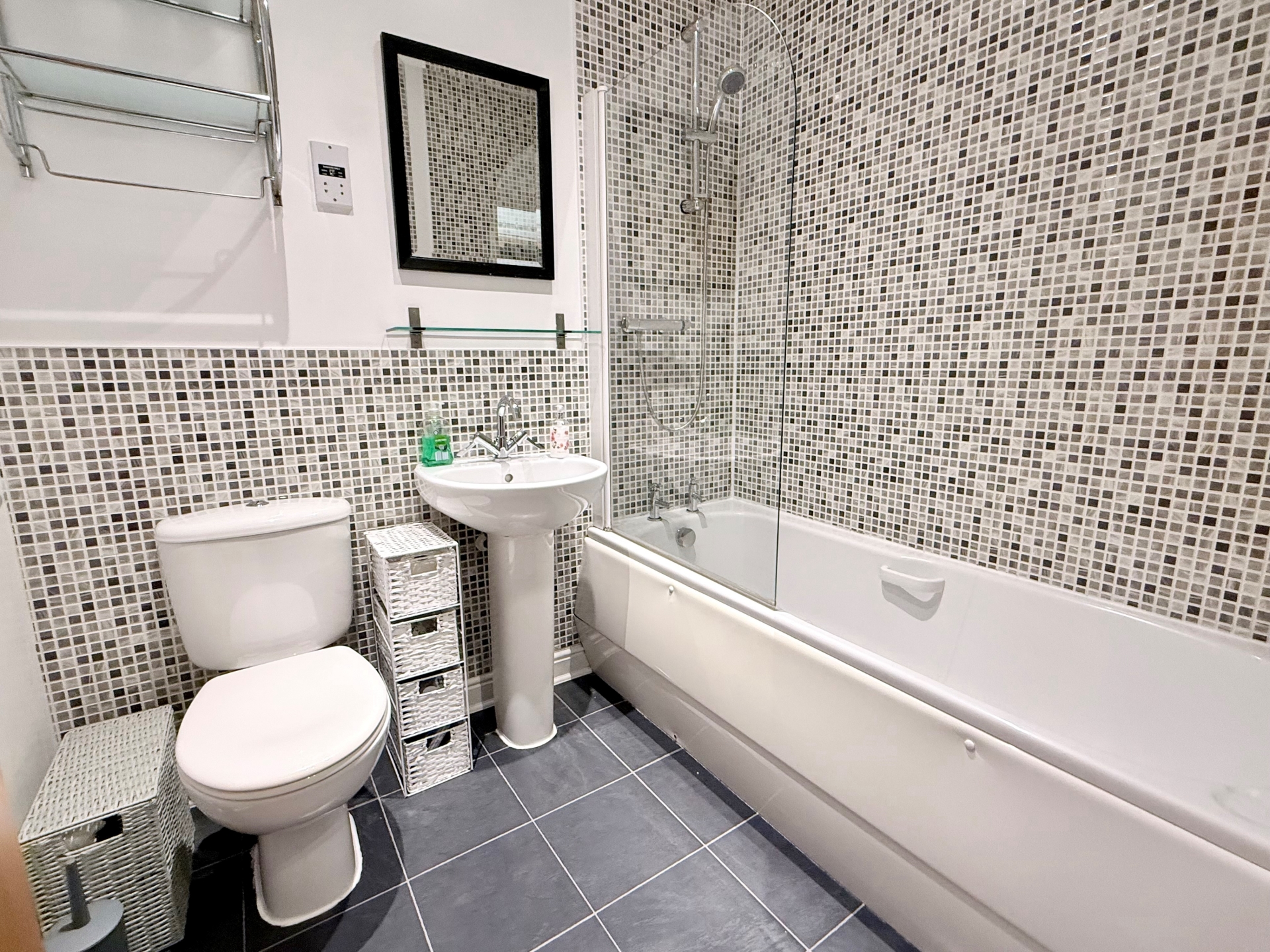 Radiator. Suite comprising panelled bath with shower over, pedestal wash hand basin and WC. Tiling to splash back areas. Tiled floor. Shaver point. Extractor. Spotlights.