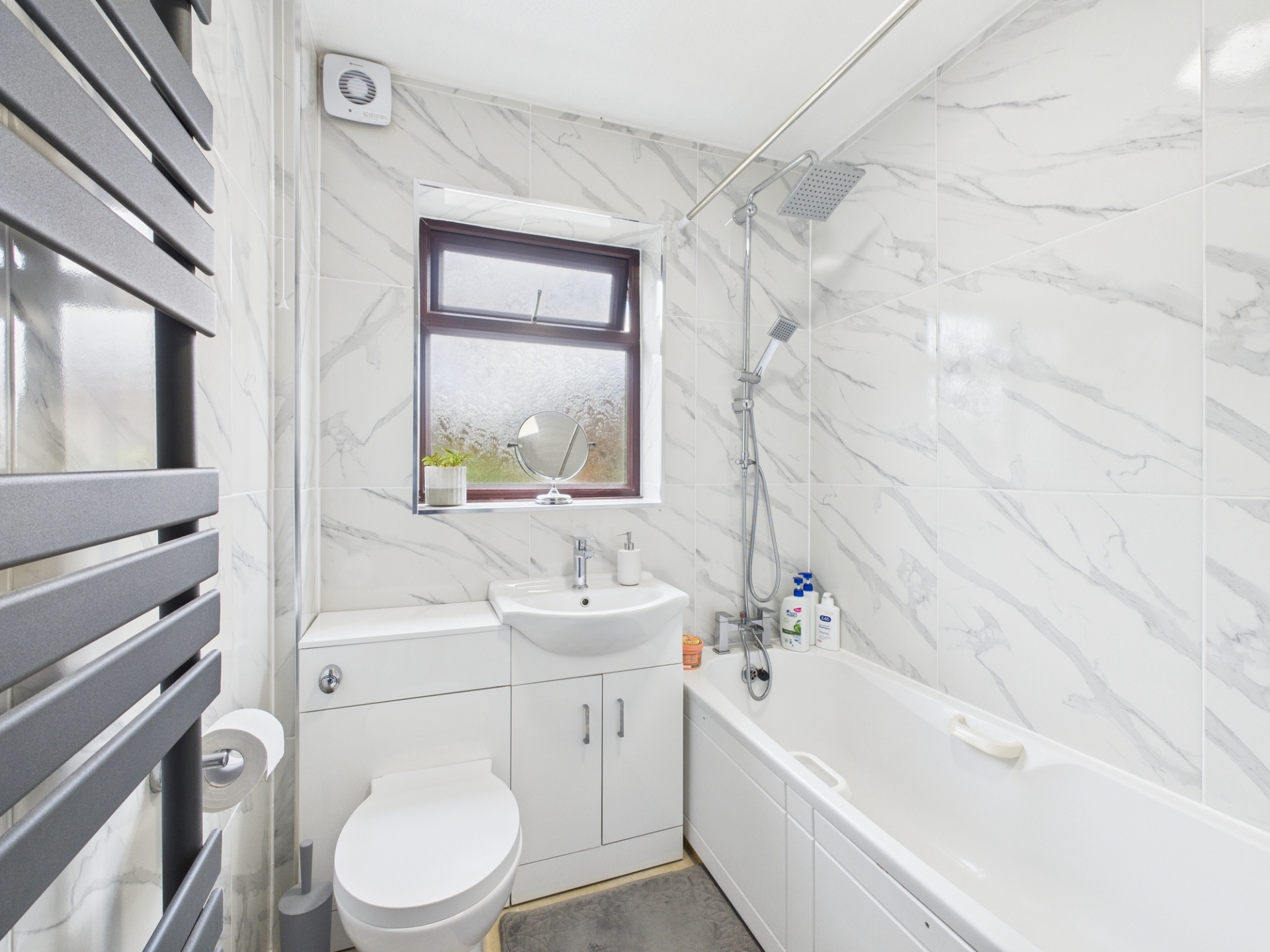 Obscure double glazed window to front elevation. Radiator. Suite comprising wash hand basin and WC set in a vanity unit and panelled bath. Tiled walls. Vinyl flooring.