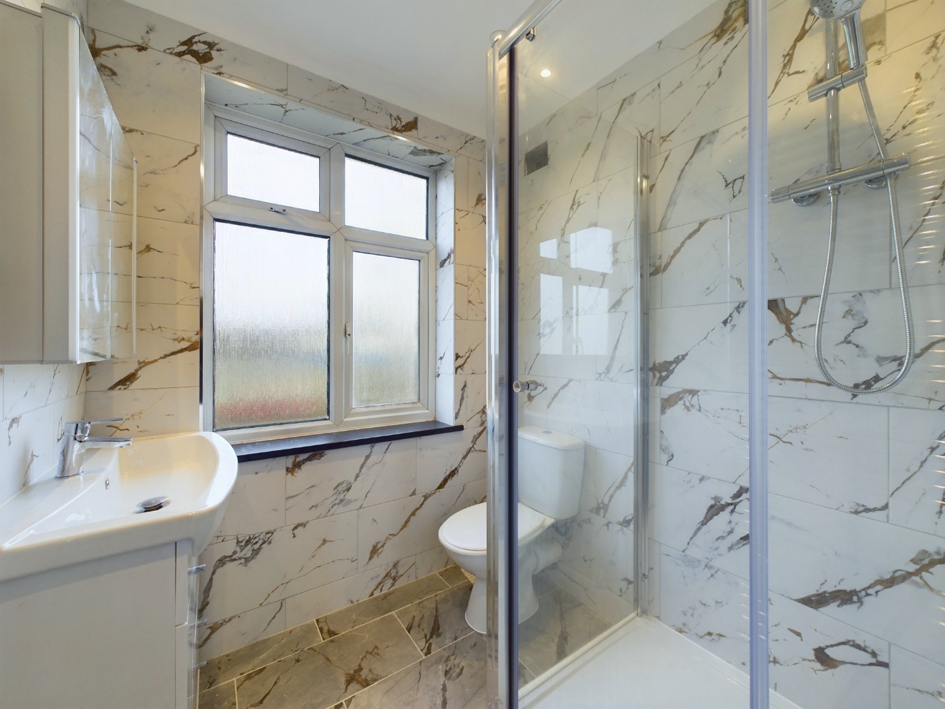uPVC frosted window to front elevation. Heated towel rail. Three piece suite comprising double shower cubicle, low level WC and vanity wash hand basin with chrome mixer tap. Extractor fan.