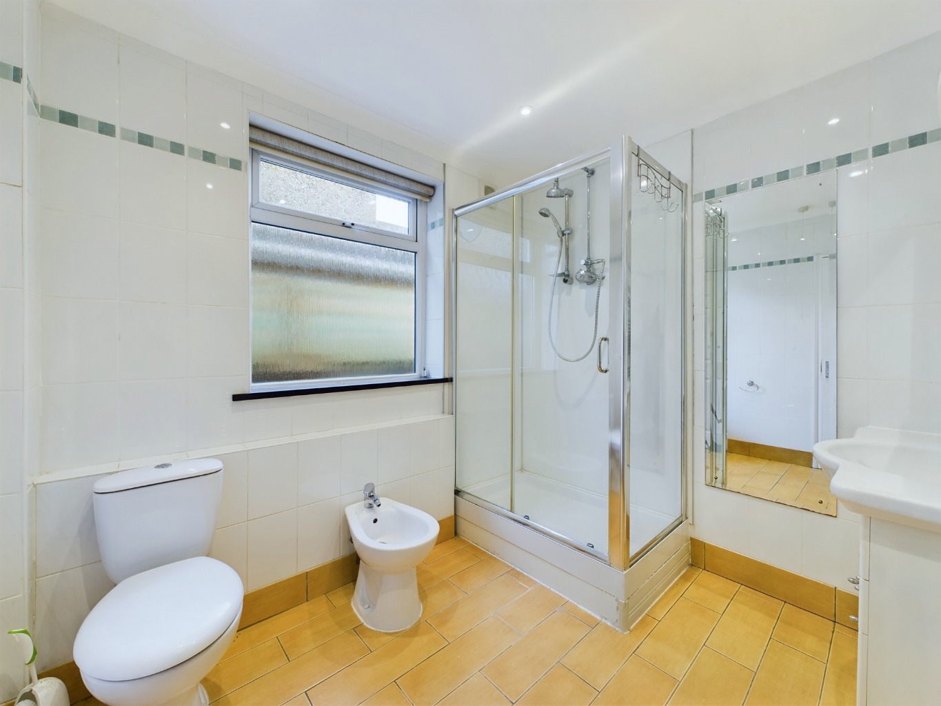 uPVC obscure glazed window to side elevation. Heated towel rail. Spotlights to ceiling. Four piece suite comprising double shower cubicle, low level WC, bidet and vanity wash hand basin with chrome mixer tap. Extractor.
