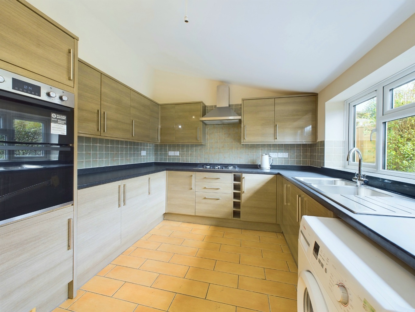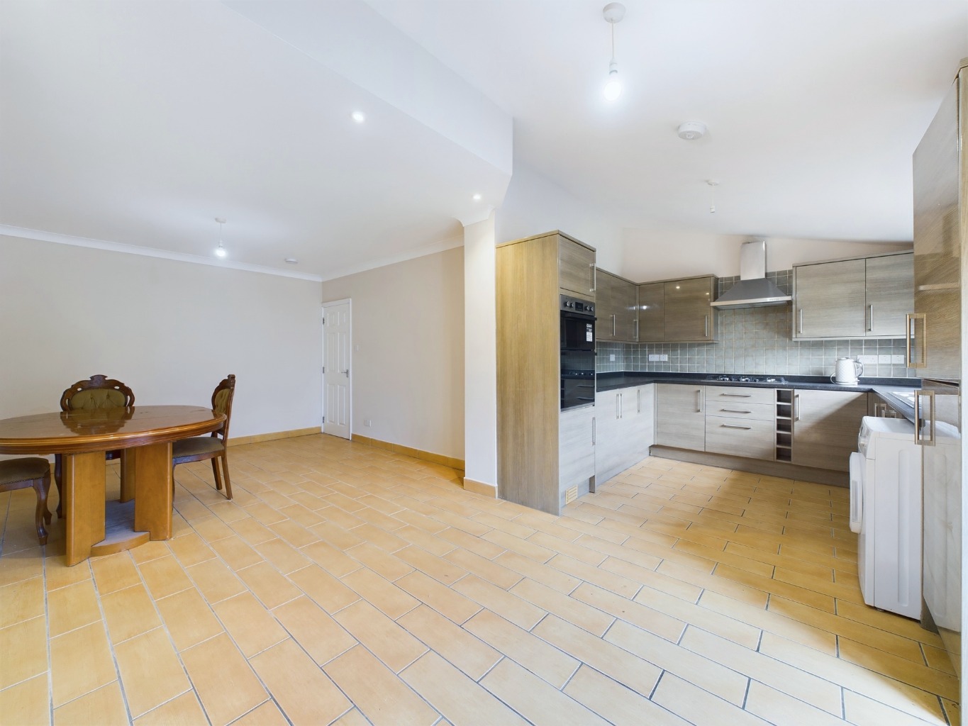 uPVC French doors to garden. uPVC double glazed window to rear elevation. Radiator. Spotlights to ceiling. A range of wall mounted and base level cupboards and drawers with work surfaces over. Integrated appliances to include fridge/freezer, five ring gas hob, extractor, fan oven and grill. Space for washing machine. Double stainless steel sink with chrome mixer tap. Television point.