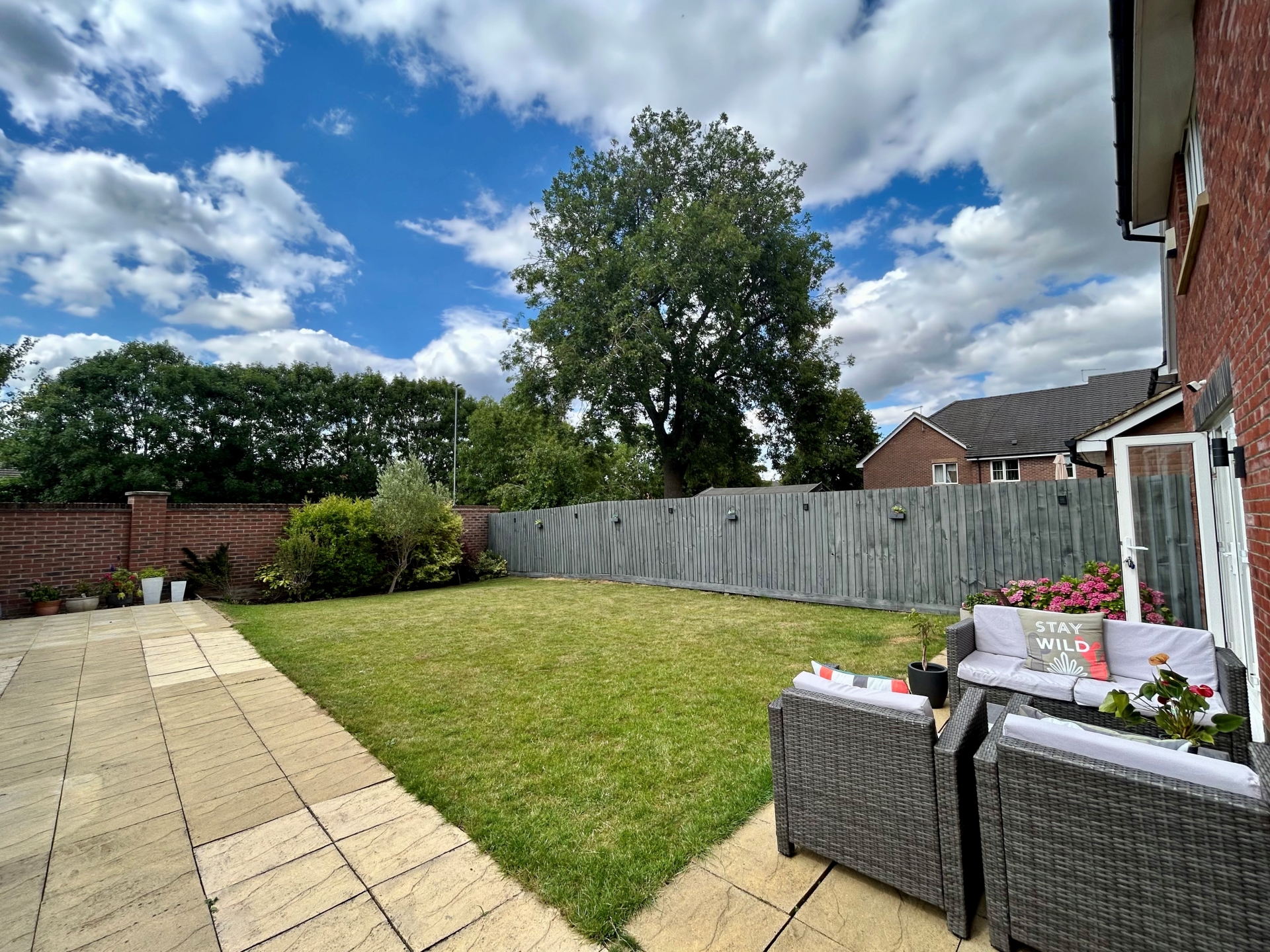 Large patio entertainment space stretching across the width of the property and the length of the garden. Enclosed with wooden fencing and a brick wall to the rear. Mature shrubs and laid to lawn.