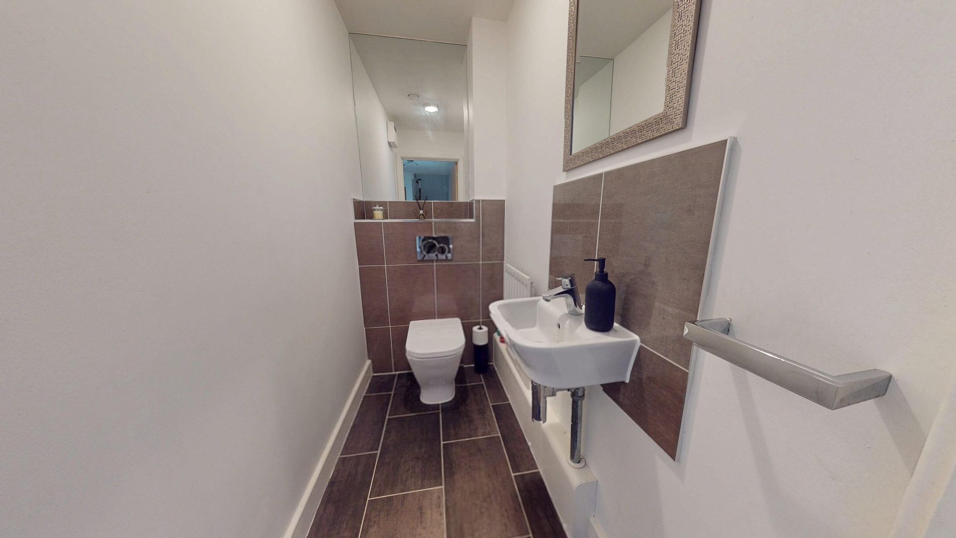 Tiled flooring. Low level WC. Wall mounted wash hand basin. Radiator. Tiling to splashback areas.