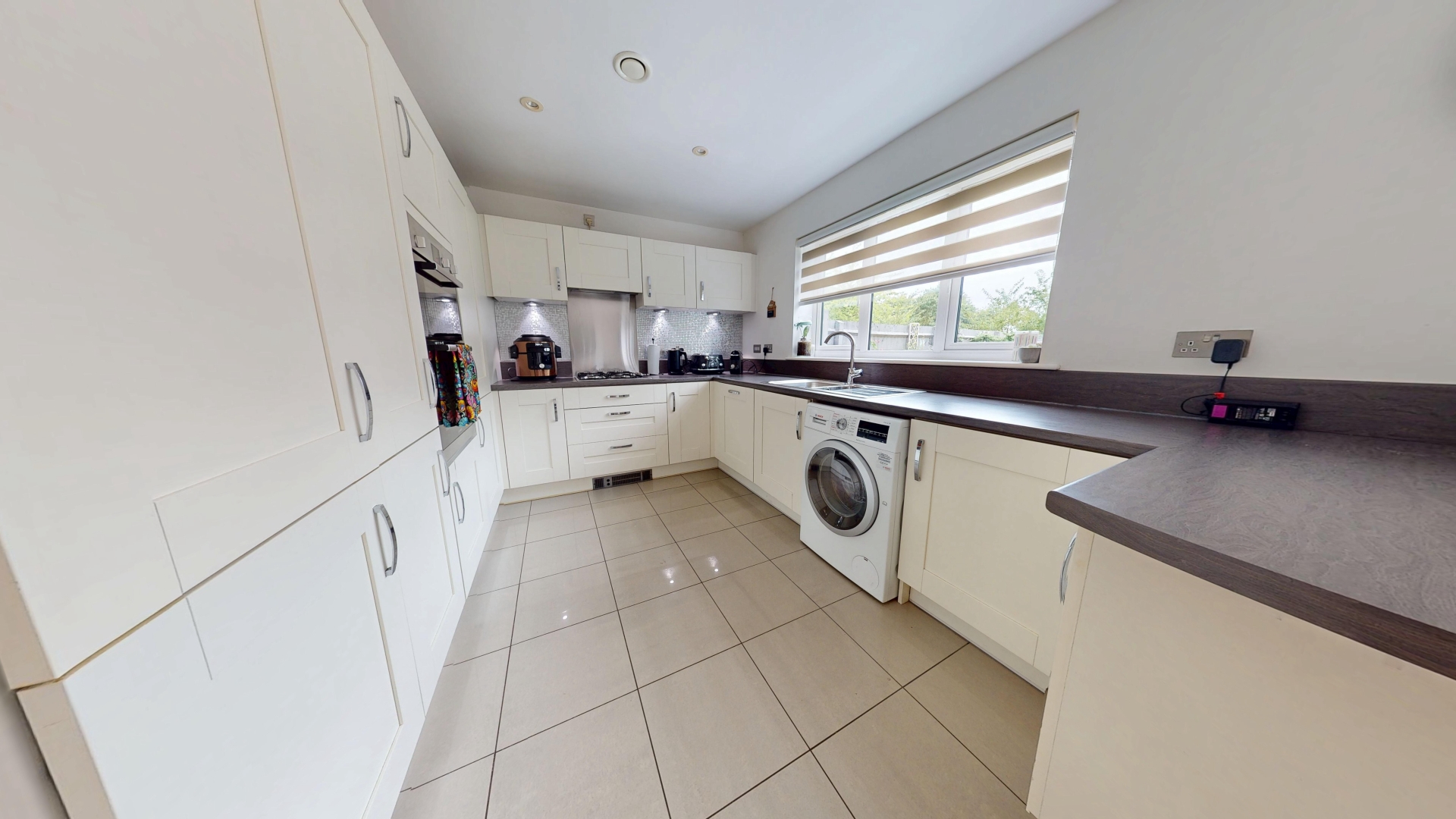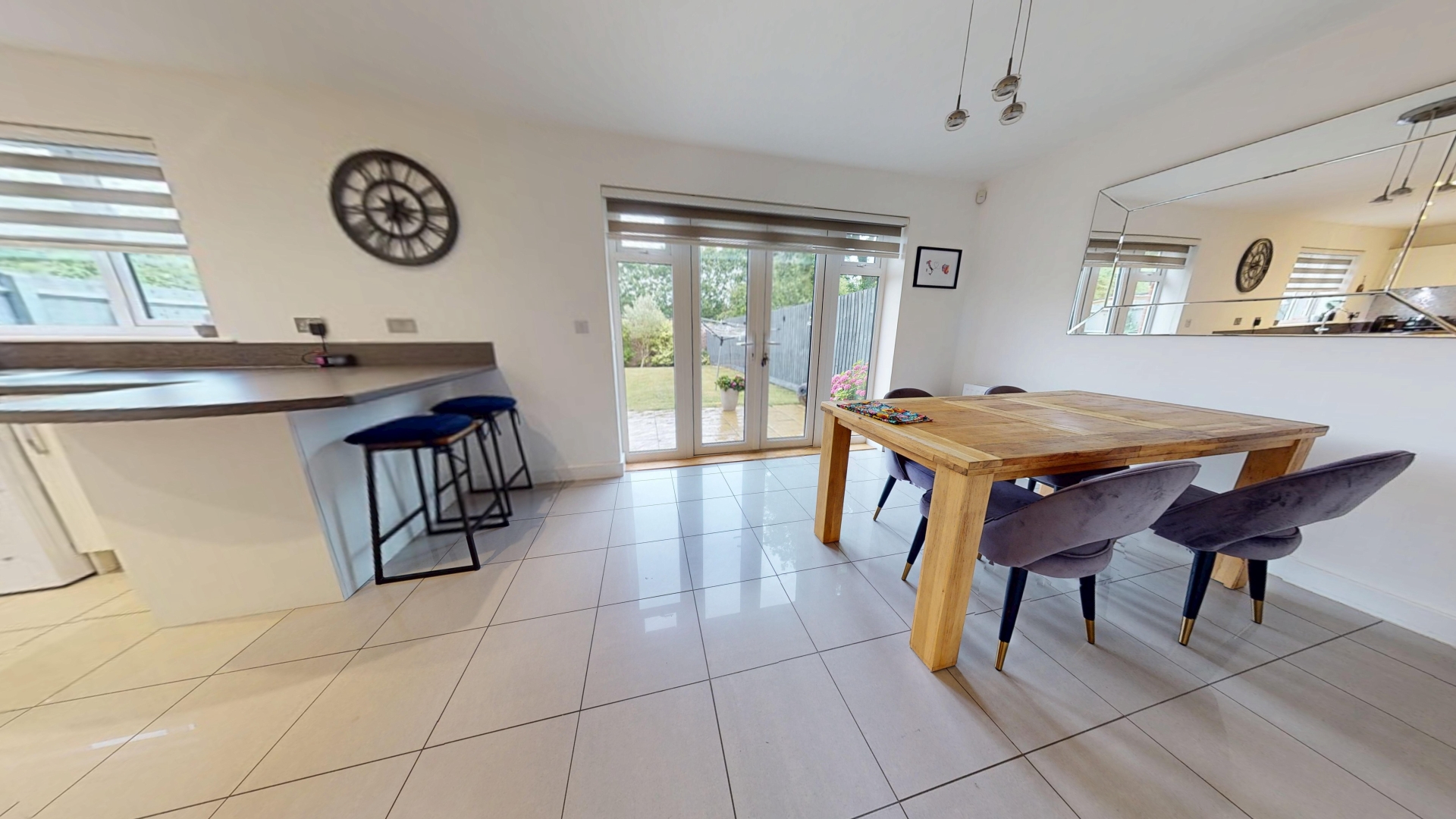 uPVC double glazing to rear elevation. uPVC double glazed French doors to rear elevation. Radiator. Tiled flooring. Range of wall mounted and base level unit . Integrated wall mounted double oven, fridge/freezer, dishwasher, hob and extractor hood. One and a half stainless steel sink with mixer tap. Space for washing machine. Tiling to splashback areas.