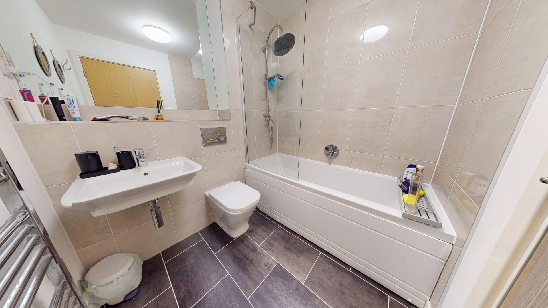Tiled flooring. Bath with shower over. Low level WC. Pedestal wash hand basin. Half height tiling. Chrome heated towel rail.
