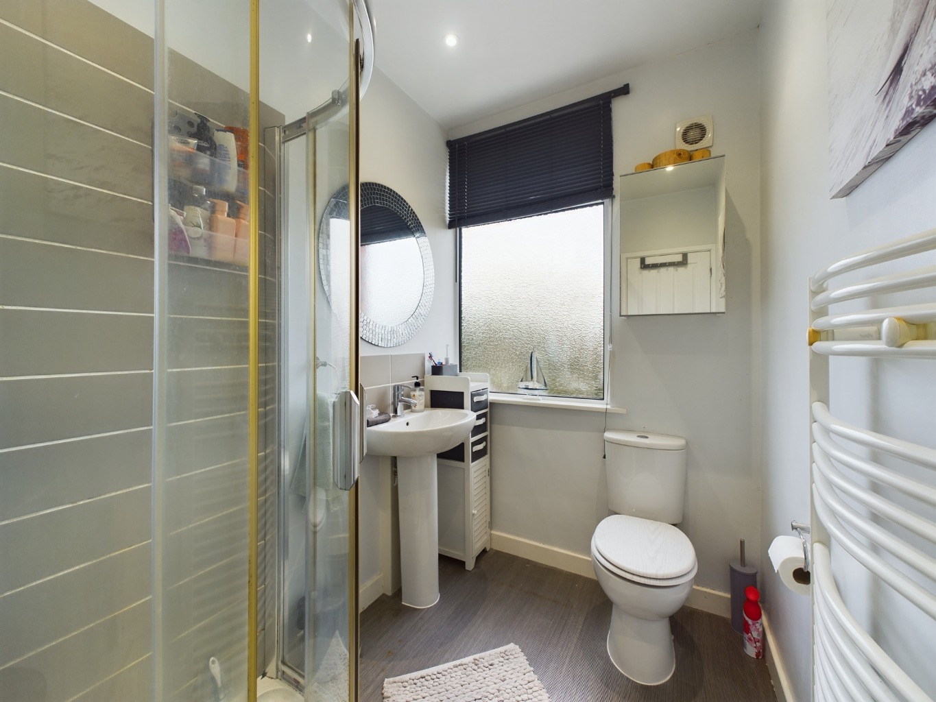 uPVC obscure double glazed window to side elevation. Electric heated towel rail. Suite comprising double shower cubicle with electric shower, pedestal wash hand basin with mixer tap over and dual flush WC. Tiled splash backs. Vinyl flooring. Recessed ceiling spotlights. Extractor fan.