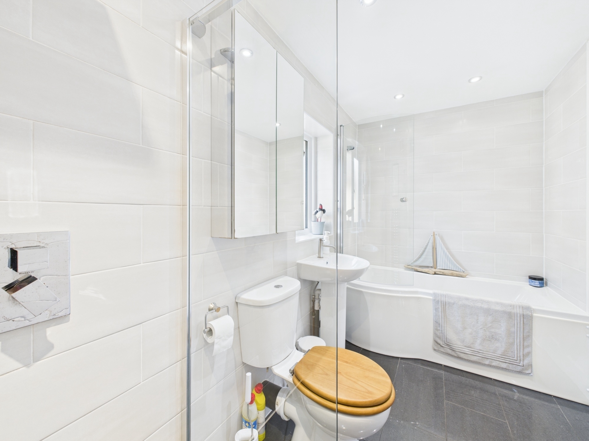 Window to side elevation. Chrome heated towel rail. Underfloor heating. Suite comprising shower bath with screen and shower attachment over, WC, wash hand basin and separate shower cubicle. Tiled walls.