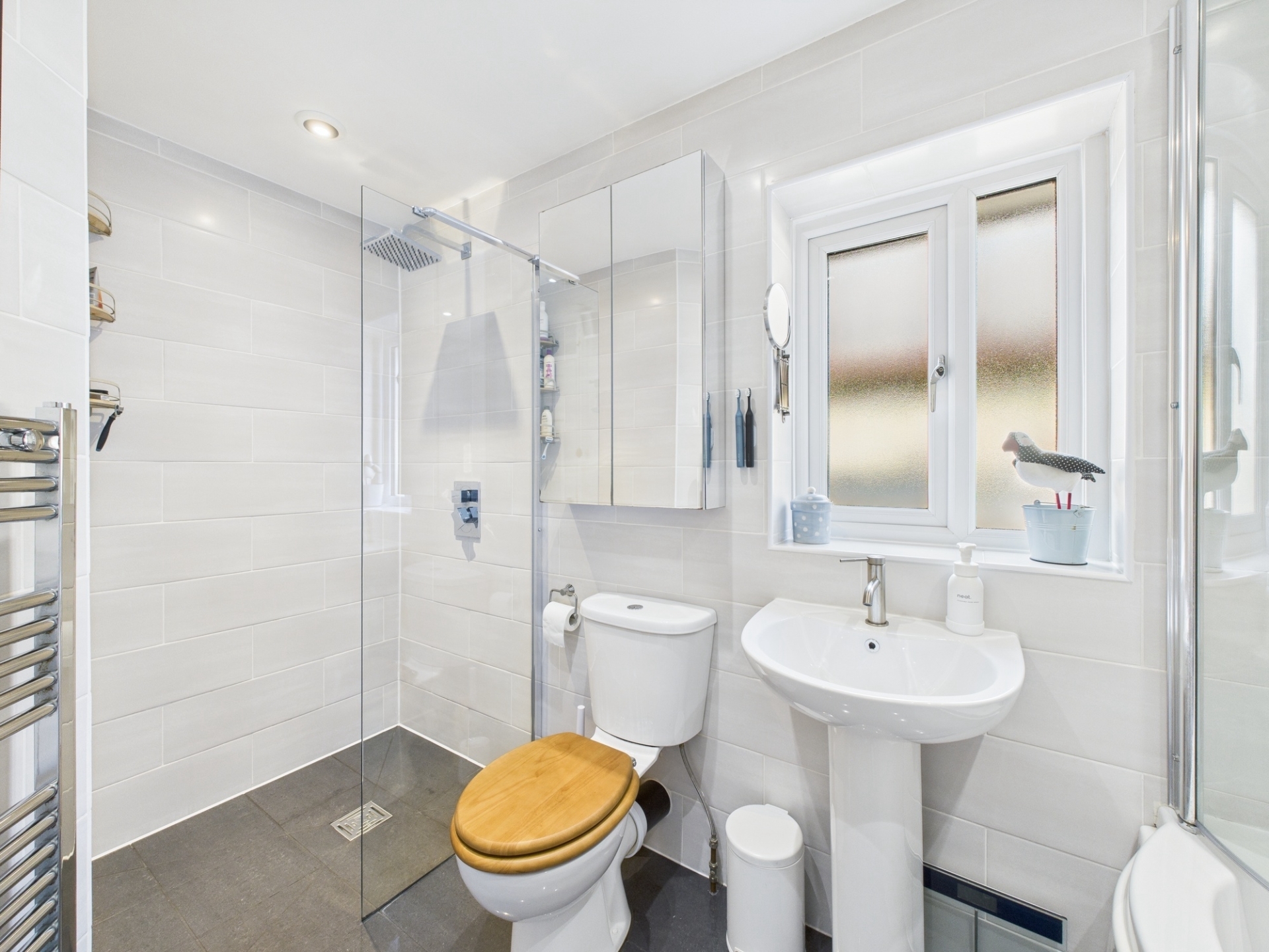 Window to side elevation. Chrome heated towel rail. Fitted with a WC and wash hand basin. Tiled splash backs. Tiled floor.
