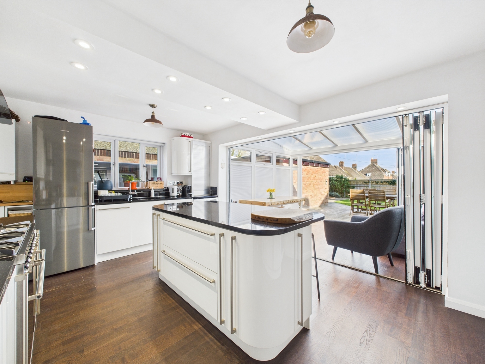 A very smart and spacious four bedroom detached house with a stunning kitchen / breakfast room and adjoining conservatory. There are two set of bi-fold doors connecting the rooms and then leading out to the landscaped garden. The kitchen worktops are granite, as is the top of the central island / breakfast bar. There is radiator heating and uPVC double glazing. There is parking for up to five cars and a garage. EPC Rating C. Council Tax Band D.