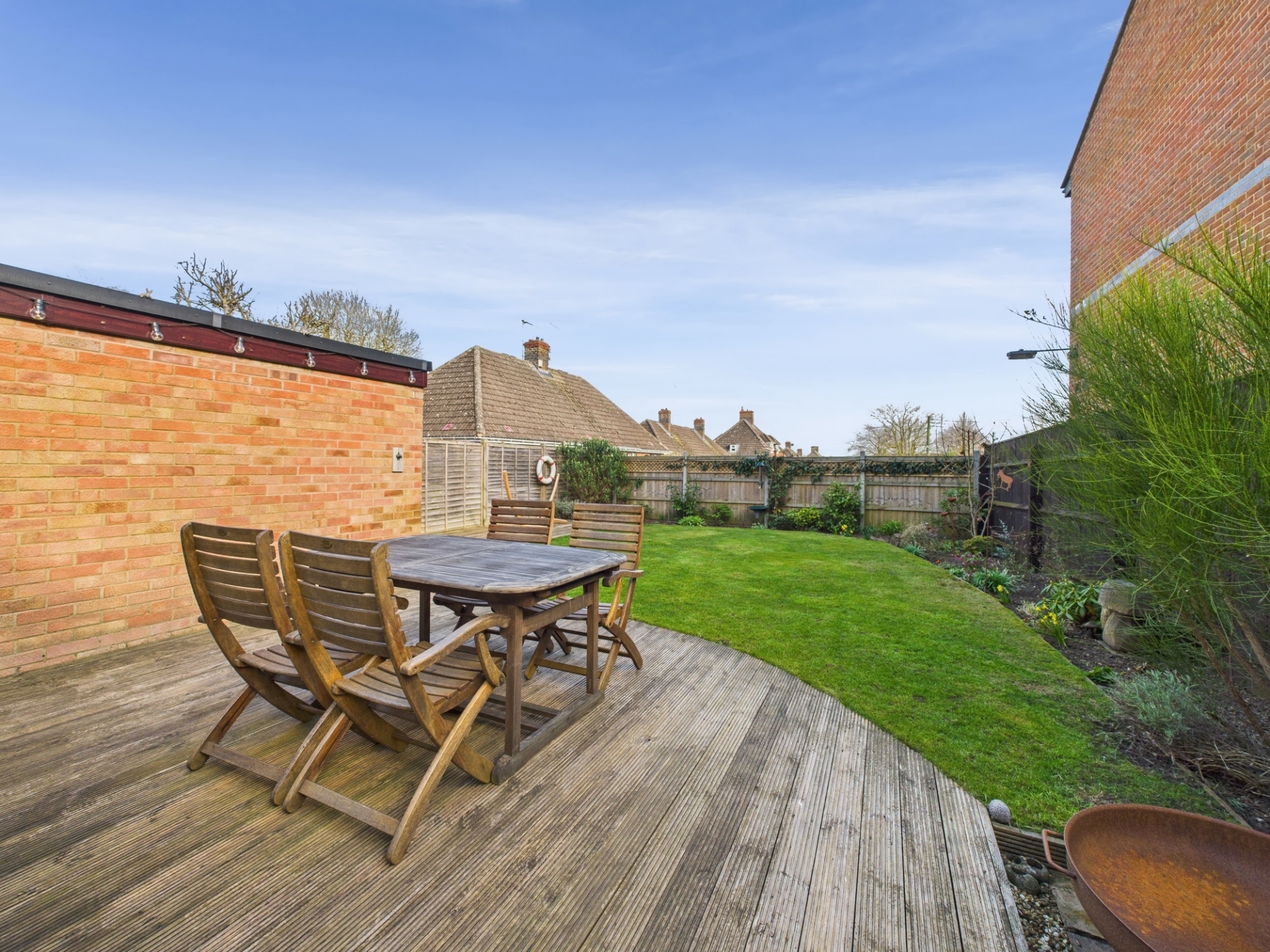 Landscaped garden with shaped lawn and decking areas. Gated side access. Planted borders.