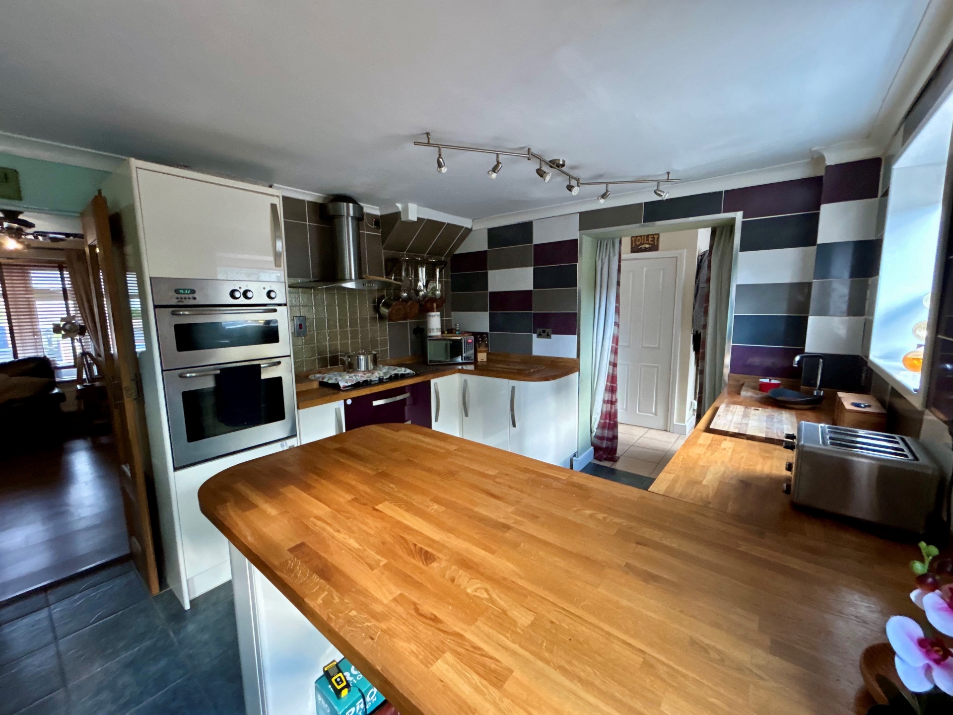 Two uPVC double glazed window to rear elevation. uPVC double glazed stable style door to rear elevation. Radiator. A range of wall mounted and base units with solid wood worksurface. Full height tiling and tiled floor. Gas hob. Extractor hood. Access to utility room.