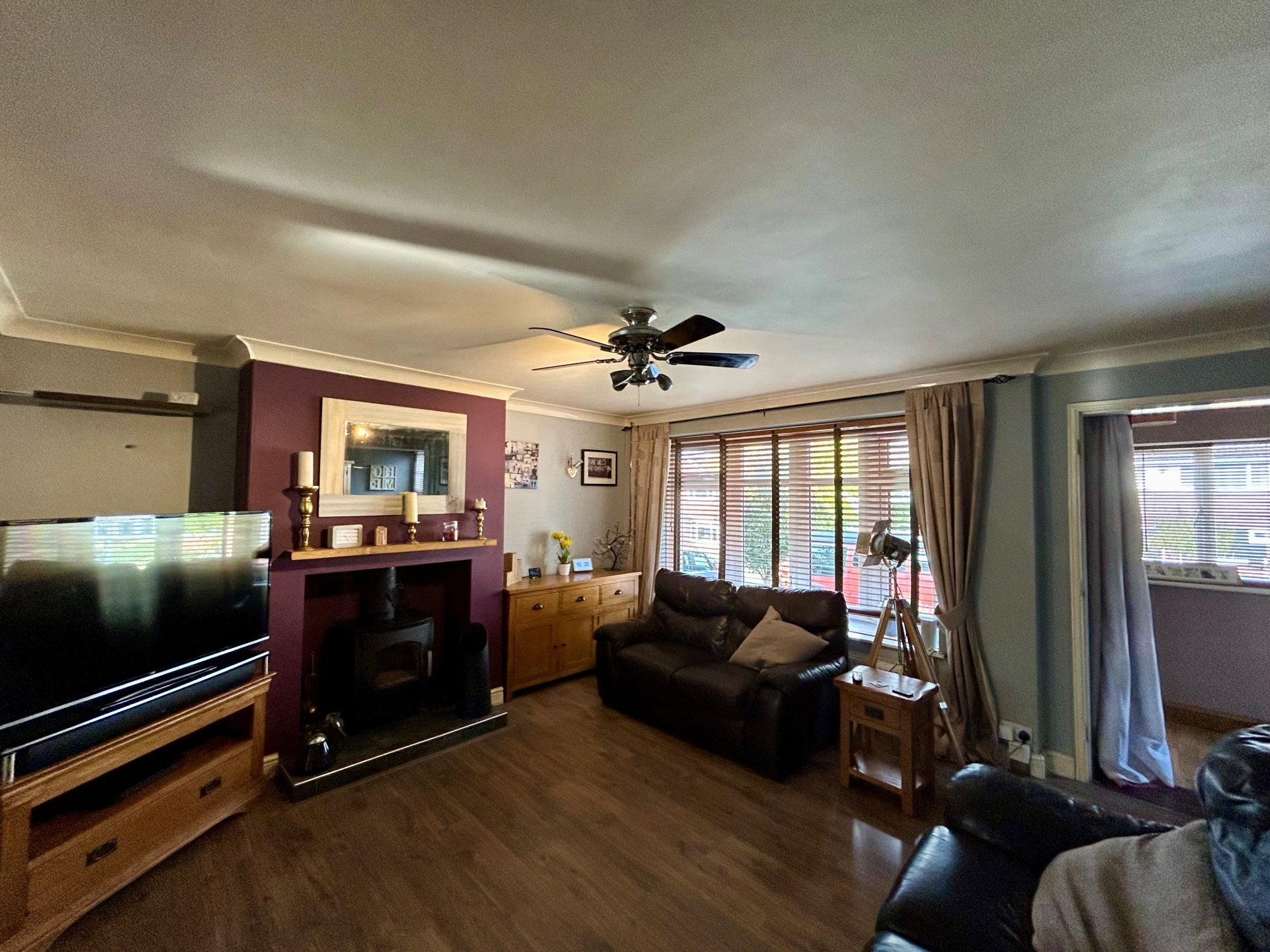 Stairs rising to first floor. uPVC double glazed bay window to front elevation and single uPVC double glazed window to front elevation. Radiator. Log burner. Understairs storage. Laminate flooring. Access to kitchen/dining room.