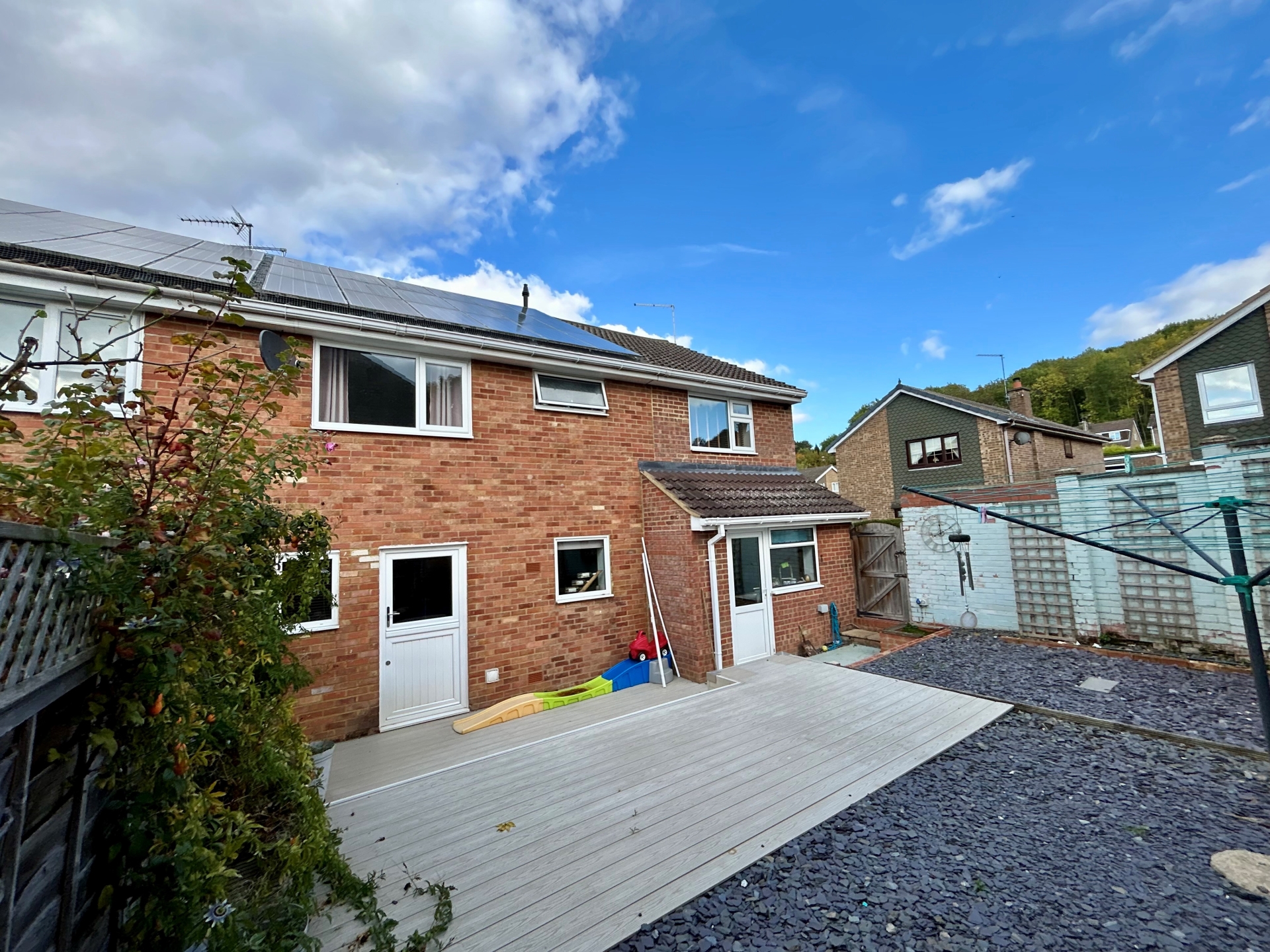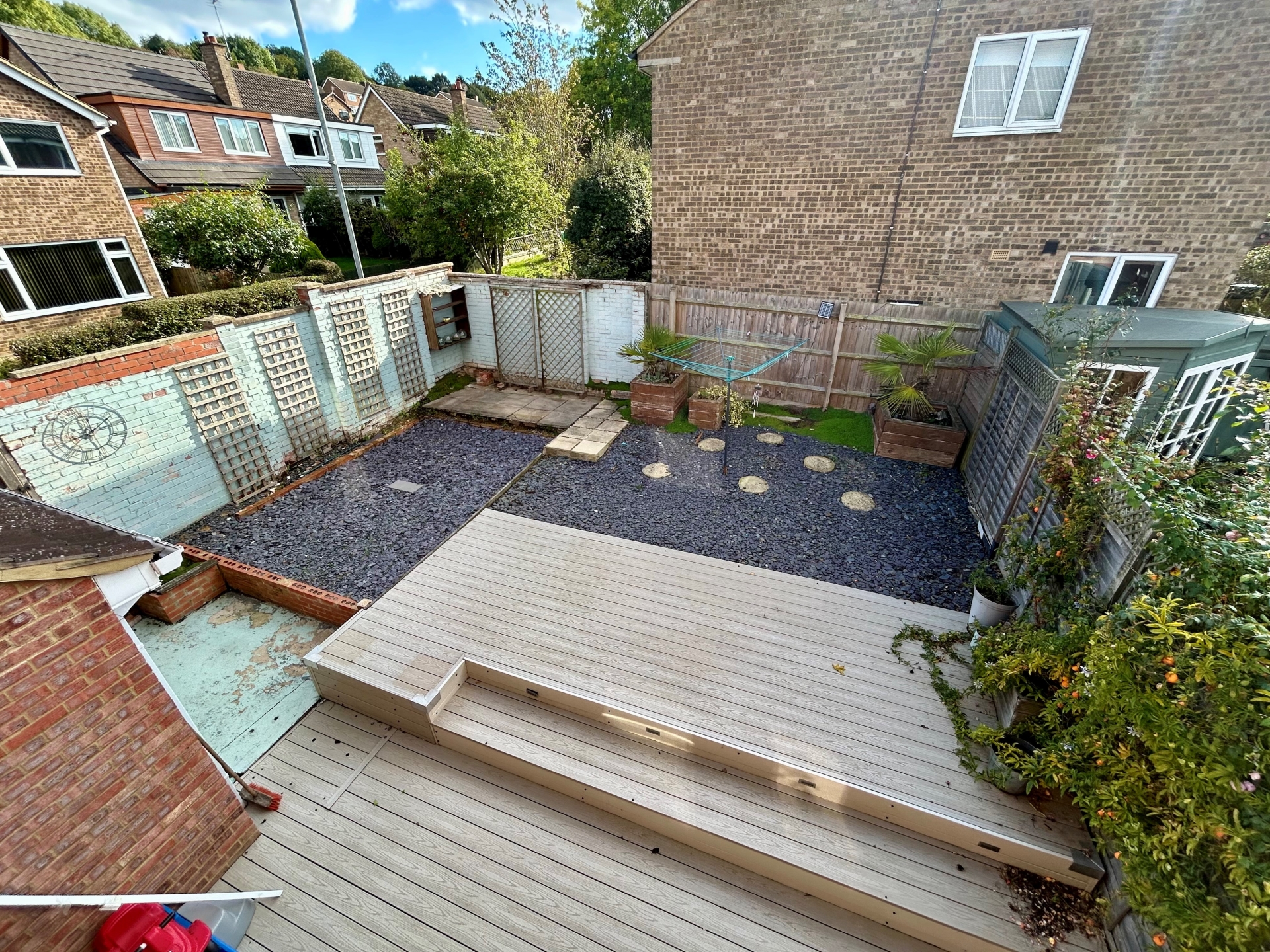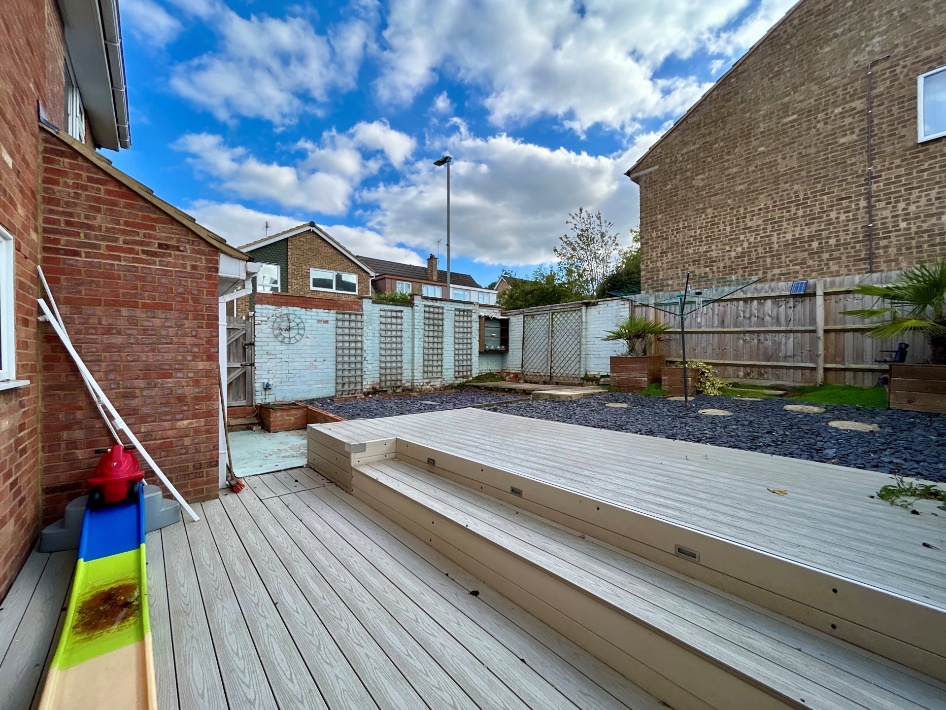 Low maintenance rear garden comprising of tiered composite decking area. Small patio area. Raised planters and two large slated areas. Enclosed with wood fencing panels and side access gate to footpath.