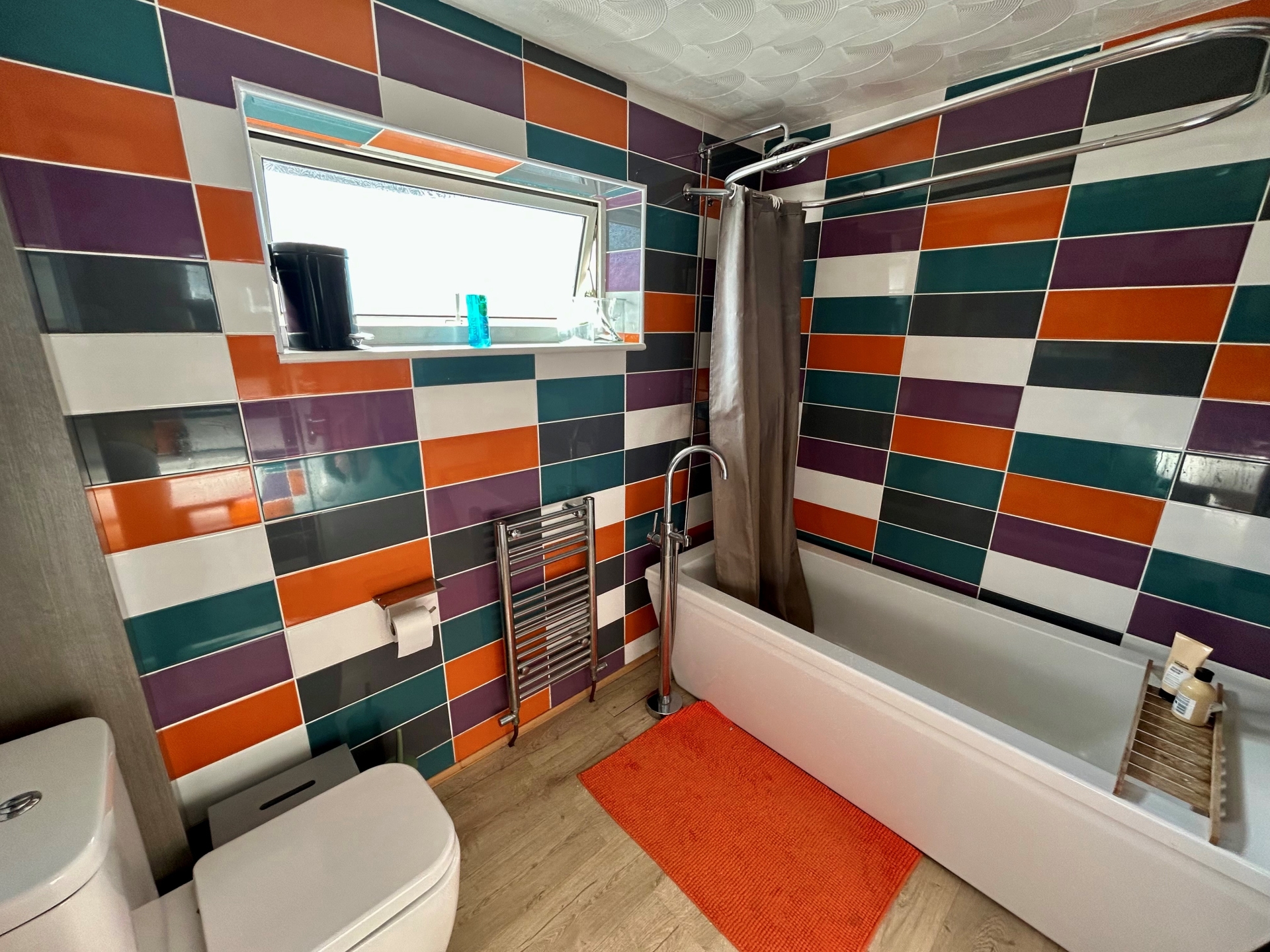 Obscure uPVC double glazed window to rear elevation. Low level WC. Pedestal wash hand basin. Heated towel rail. Bath with shower over. Full height tiling.