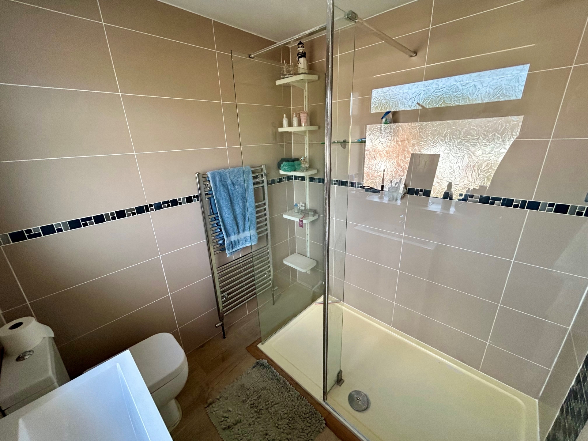 uPVC obscure double glazed window to front elevation. Heated towel rail. Large walk in shower cubicle. Full height tiling. Wash hand basin in vanity unit. Low level WC.