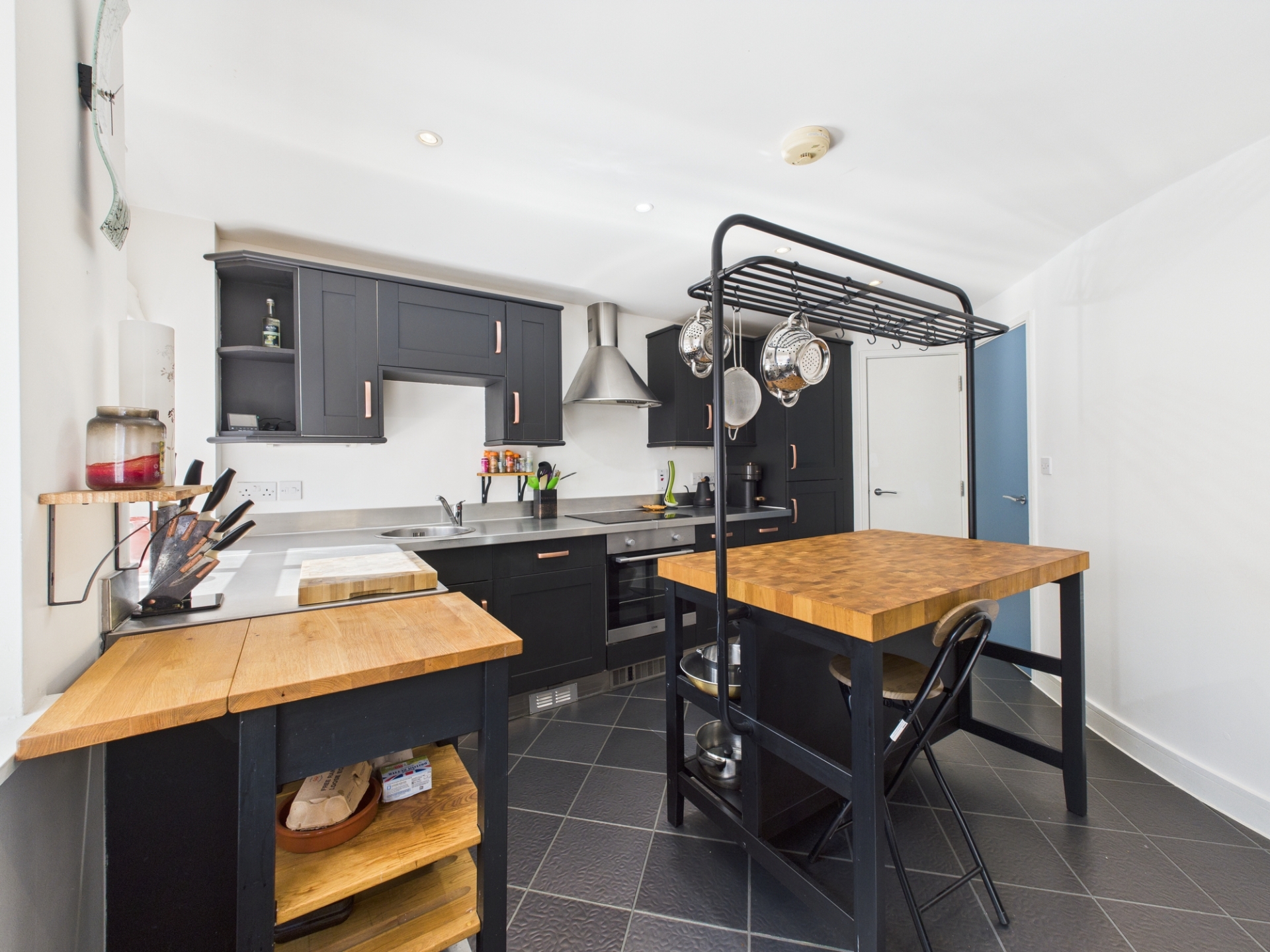 uPVC double glazed windows to front elevation. Fitted with a range of wall mounted and base level cupboards and drawers with stainless steel work surfaces over. Four ring electric hob with oven below and stainless steel extractor over. Built in washing machine, dishwasher and fridge/freezer. Inset stainless steel sink with mixer tap over. Stainless steel splash back areas. Space for table and chairs. Karndean flooring. Spotlights to ceiling. Underfloor heating.