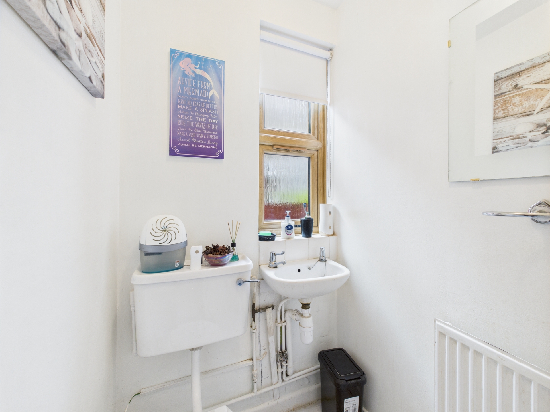 Obscure UPVC double glazed window to side elevation. Radiator. Fitted with a two piece suite comprising wall mounted wash hand basin and WC. Tiling to splash back areas. Wood effect vinyl flooring.