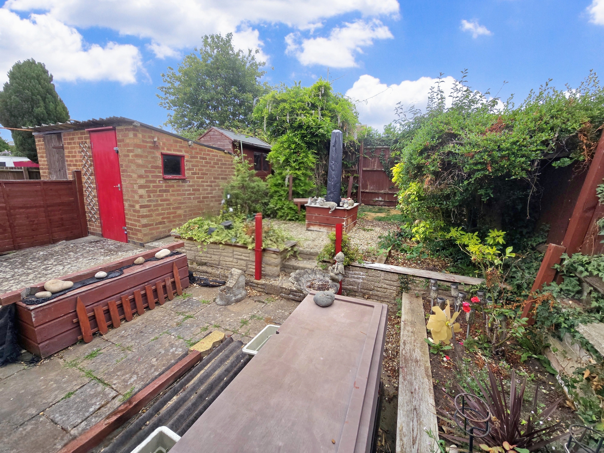 Private garden with paved patio area, raised bed to one side and built in bench with storage to the other. Steps lead up to a pebbled area surrounded by bedded plants, trees and shrubs, enclosed by timber panelled fencing. Brick built shed. External light. Timber panelled side access gate. External power sockets.