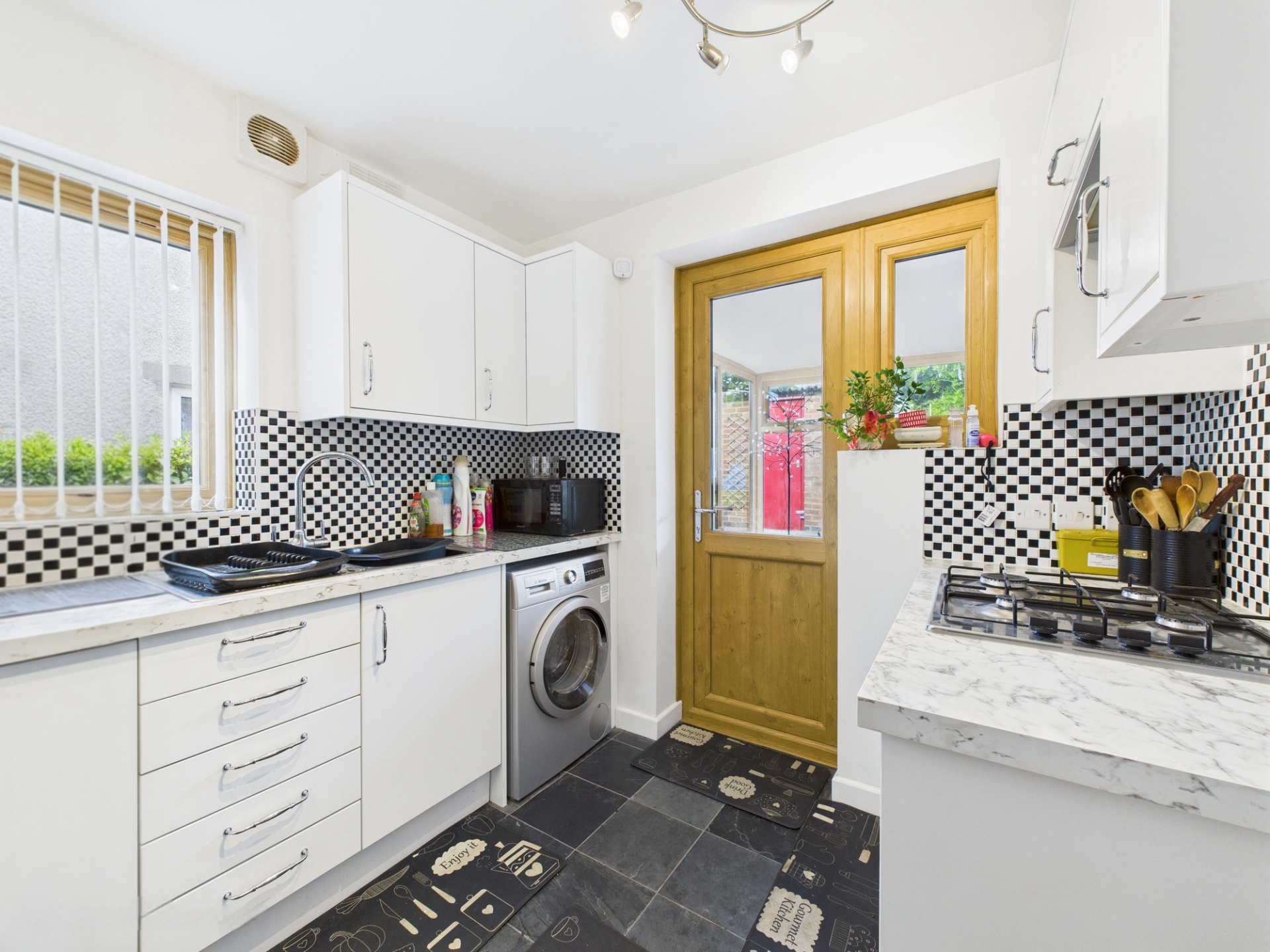 Dual aspect with UPVC double glazed windows to side and overlooking the conservatory. Radiator. Fitted with a range of wall mounted and base level units and drawers with roll top work surface over. One and a half bowl sink and drainer unit with mixer tap over. Fitted oven, gas hob and extractor hood over. Tiled floor. Tiling to splash back areas. Space for white goods. UPVC double glazed door to conservatory.