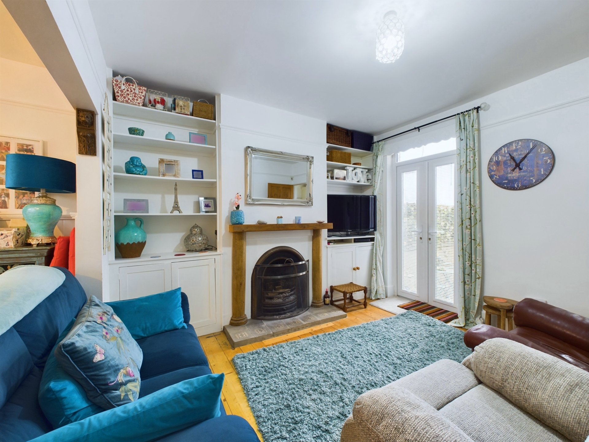 uPVC double glazed French doors to rear elevation. Period style radiator. Cast iron fireplace and surround with open chimney with cupboards and shelving to either side. Stripped floorboards. Open plan to: