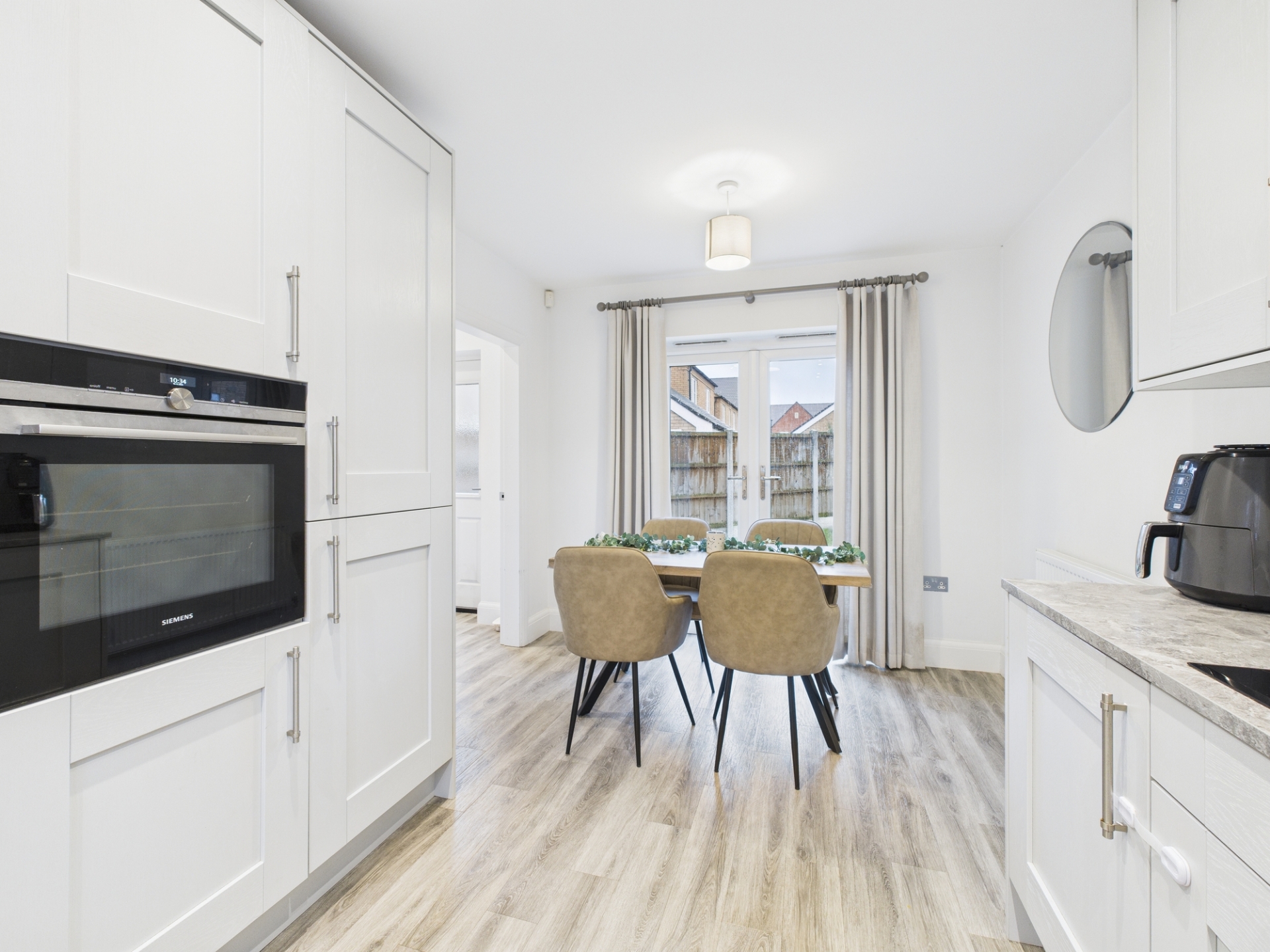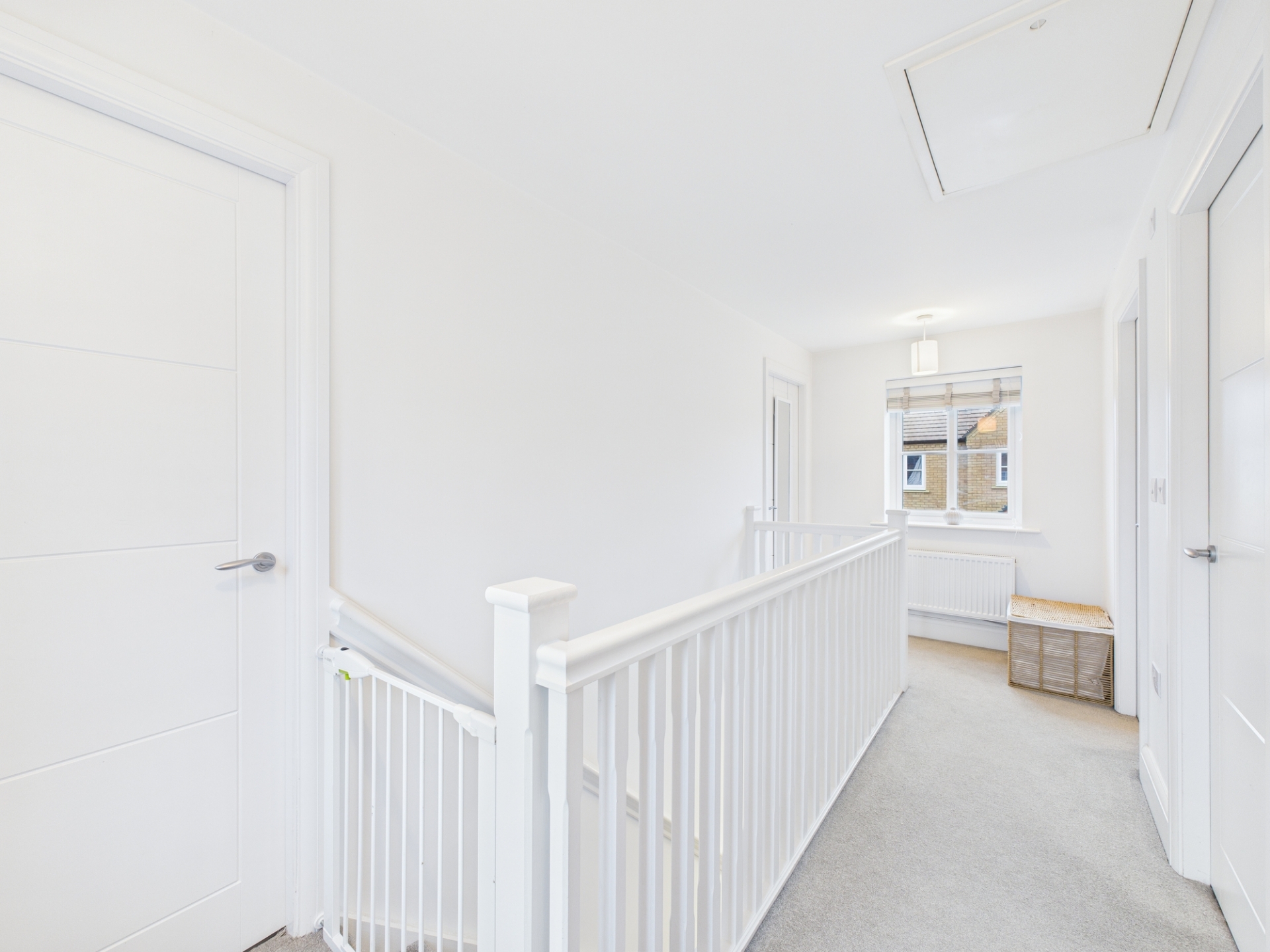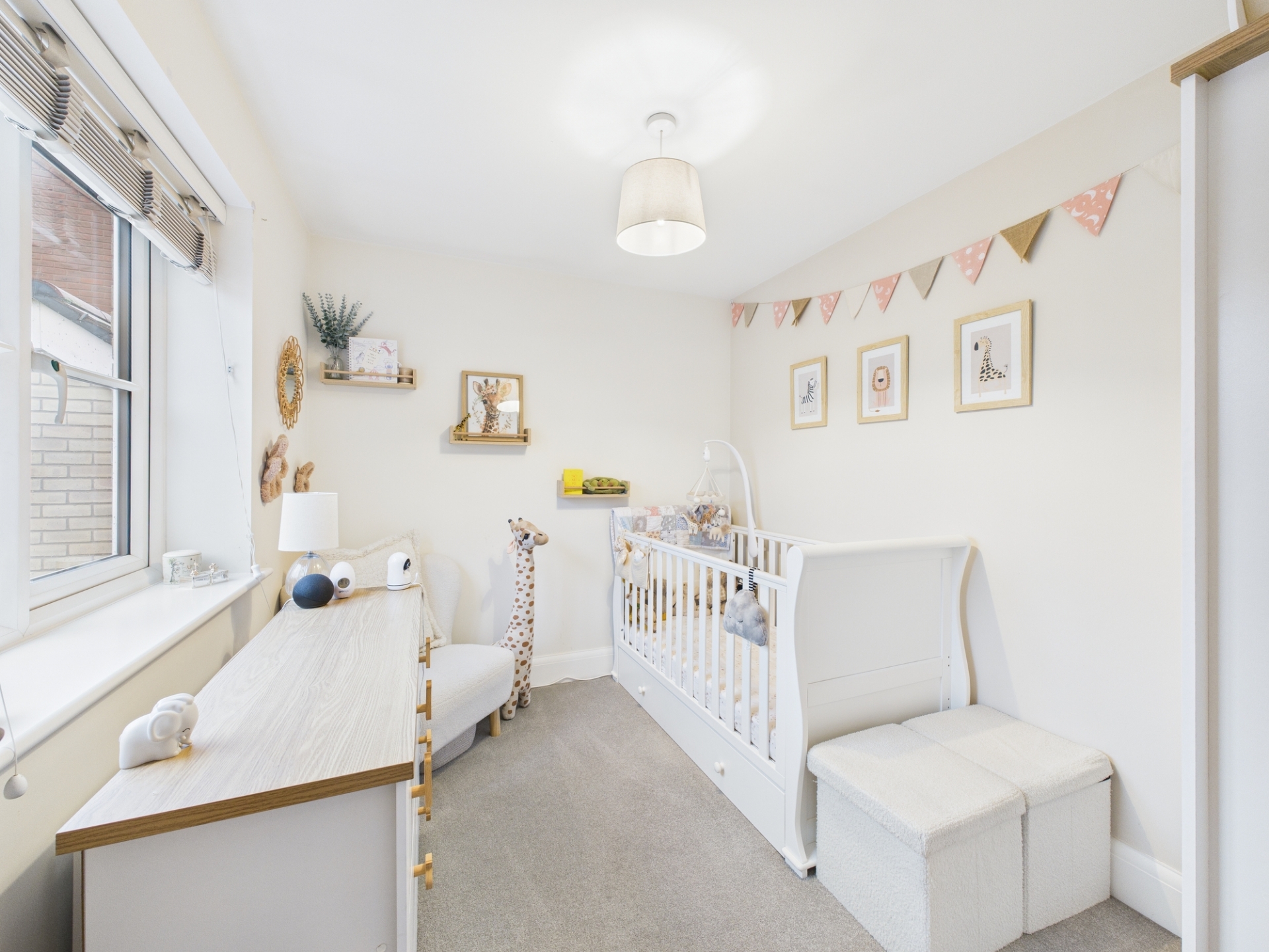 Upstairs, the home offers a generous principal bedroom with fitted wardrobes, a further double bedroom and a well proportioned third bedroom, ideal as a nursery or home office, all served by a modern family bathroom.