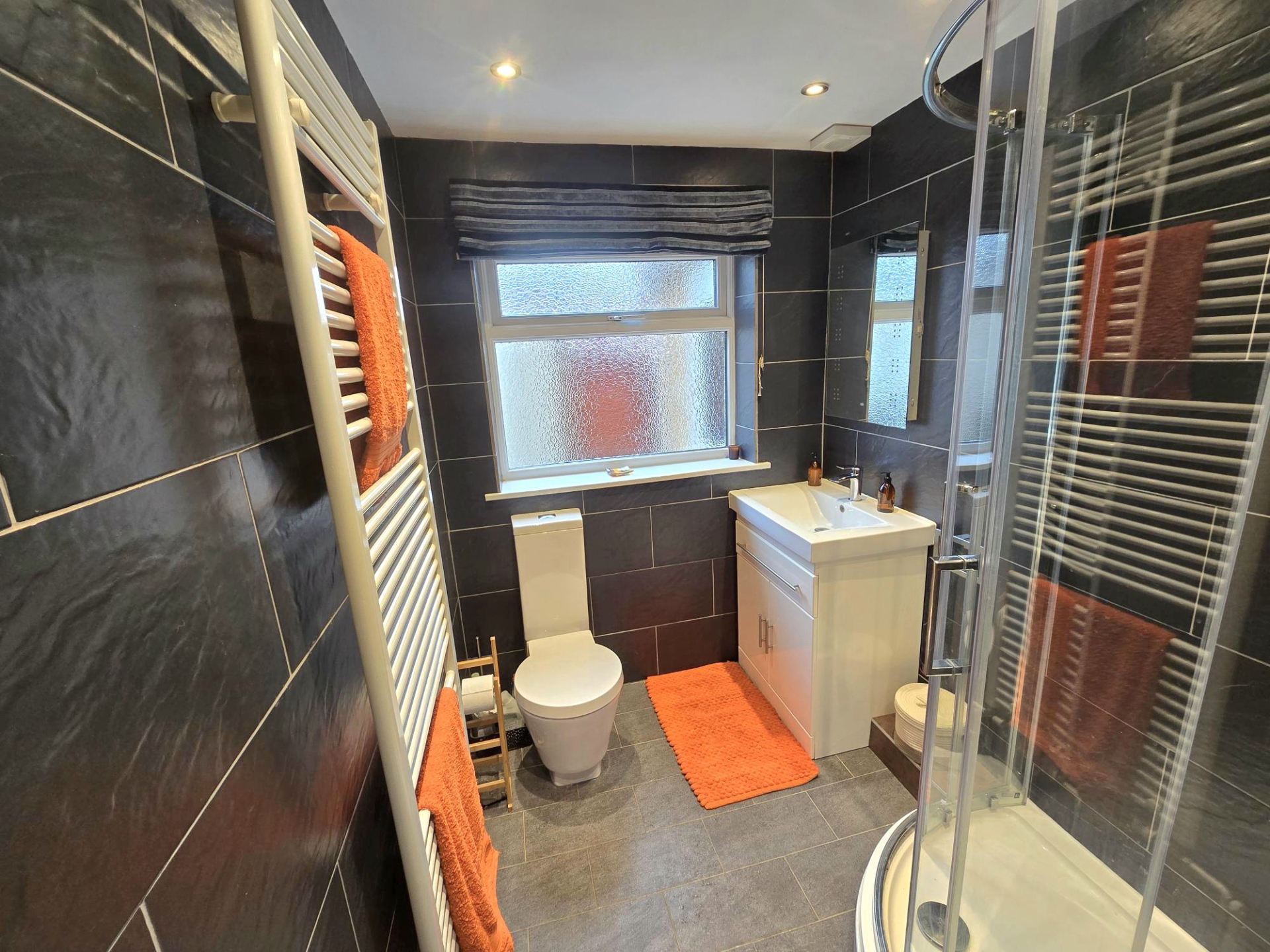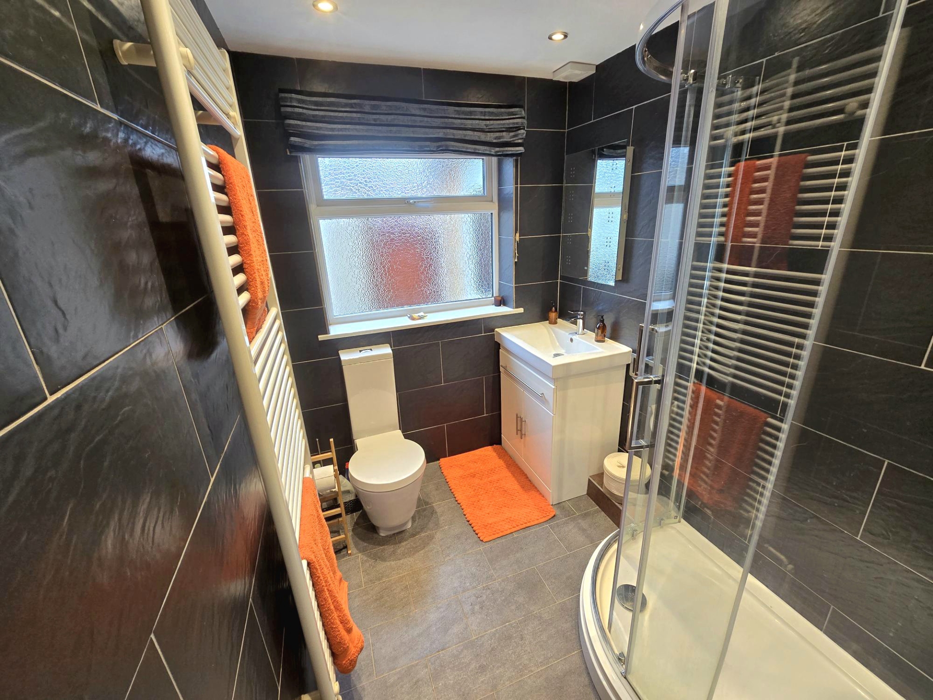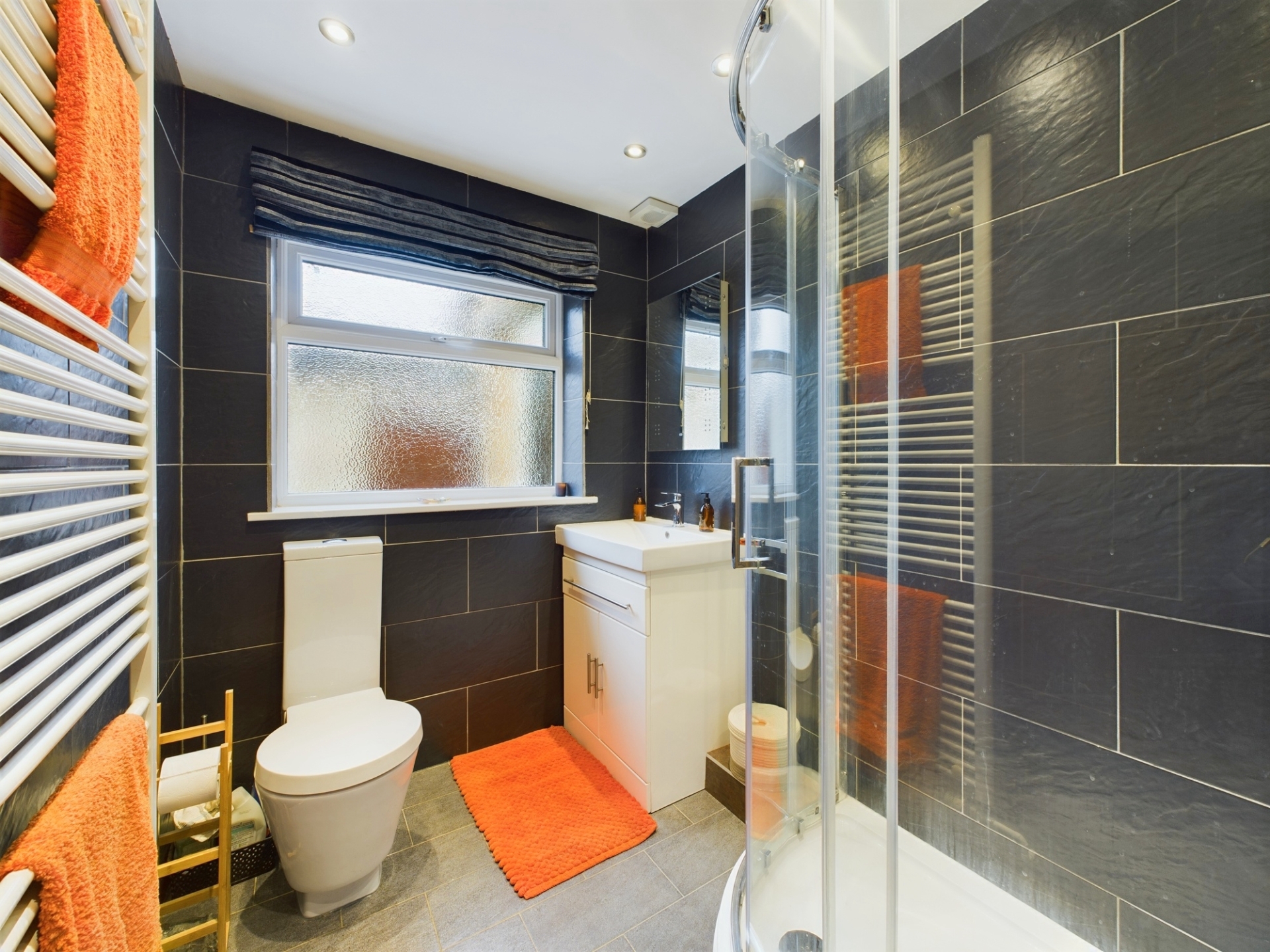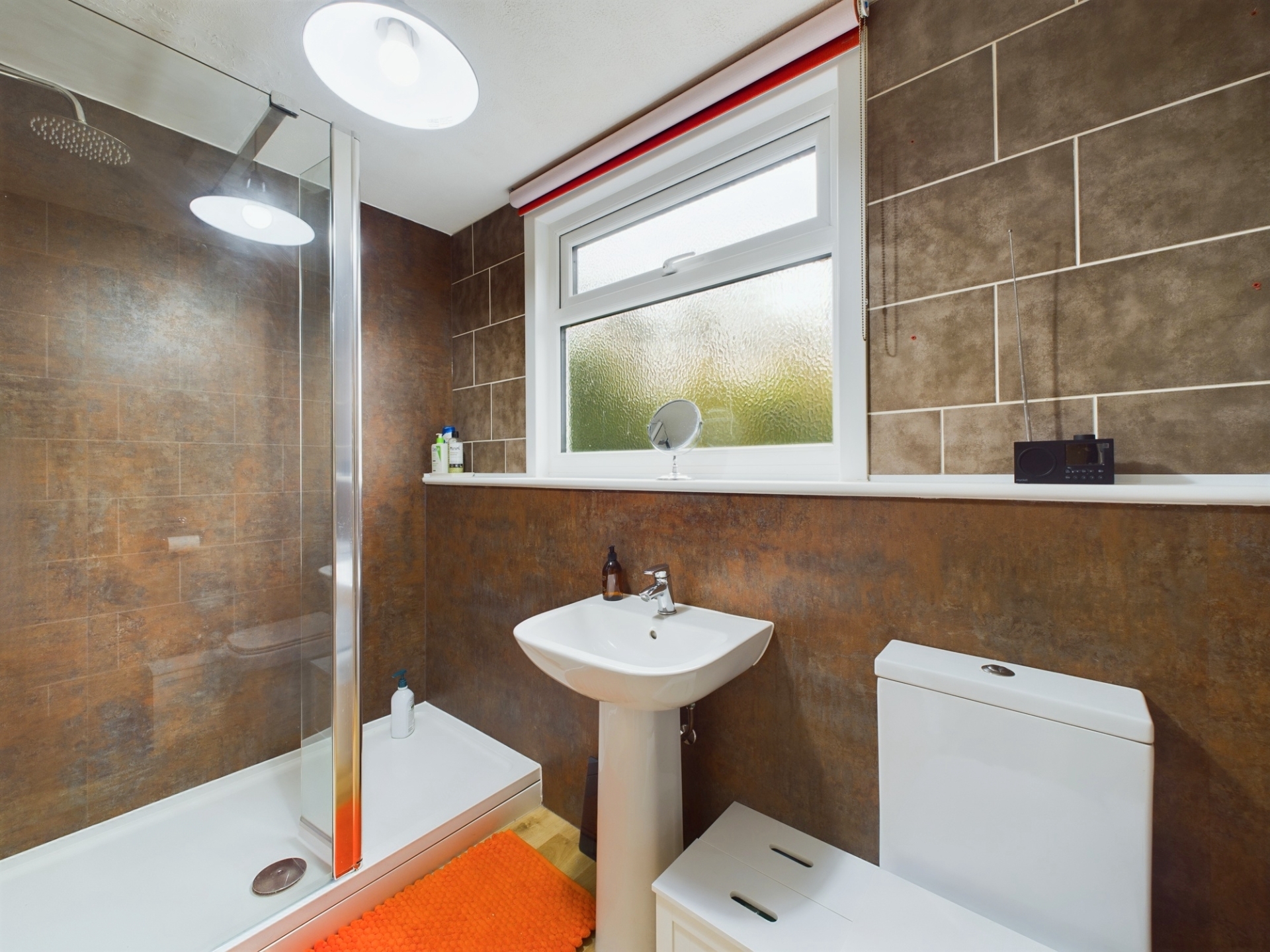 uPVC double glazed obscure window to rear elevation. Heated towel rail. Suite comprising low level WC, pedestal sink with stainless steel mixer tap and walk in double shower. Full height tiling.