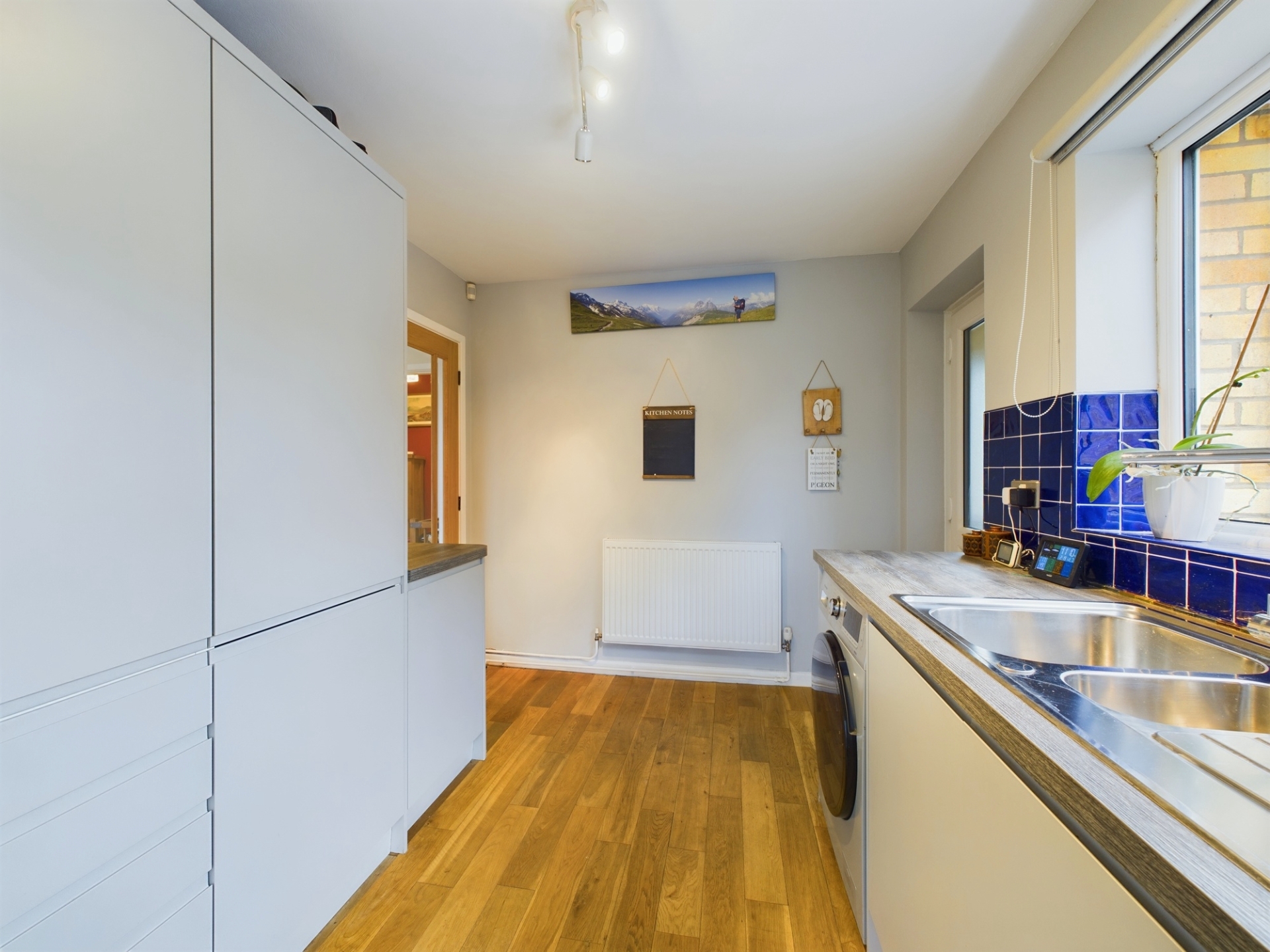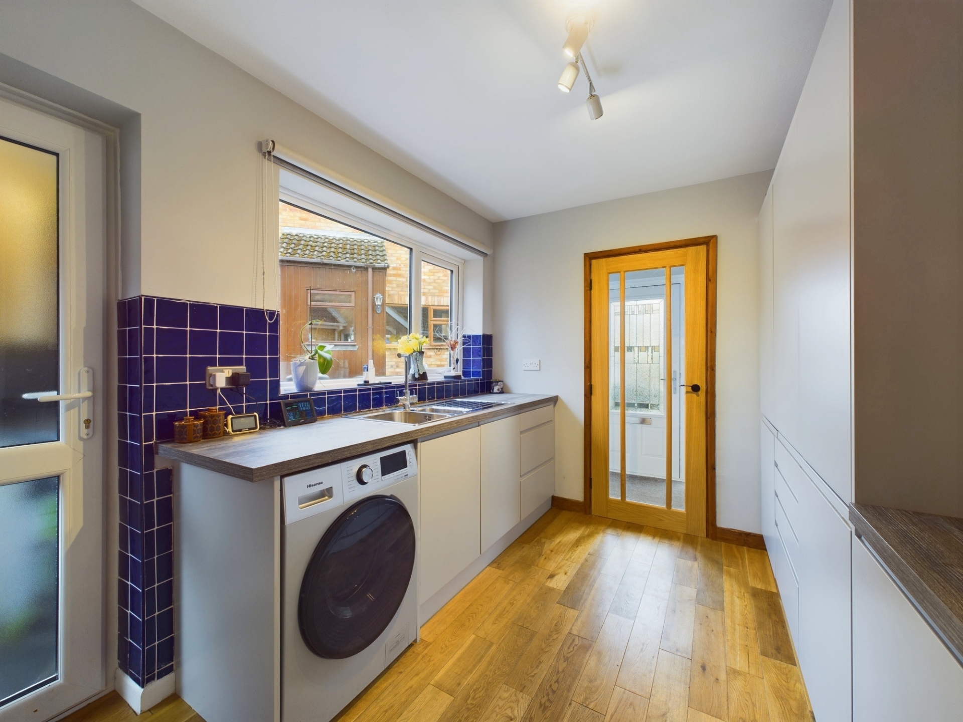 uPVC double glazed window to side elevation. A range of base level units. Stainless steel one and a half bowl sink and drainer. Tiling to splash areas. Roll top work surface. Radiator. Wood flooring. Access to boot room.
