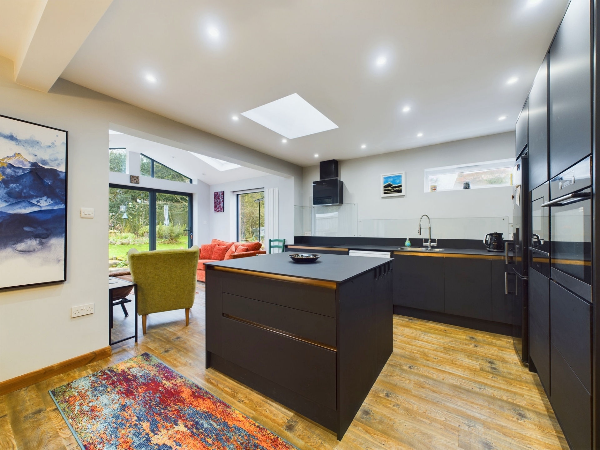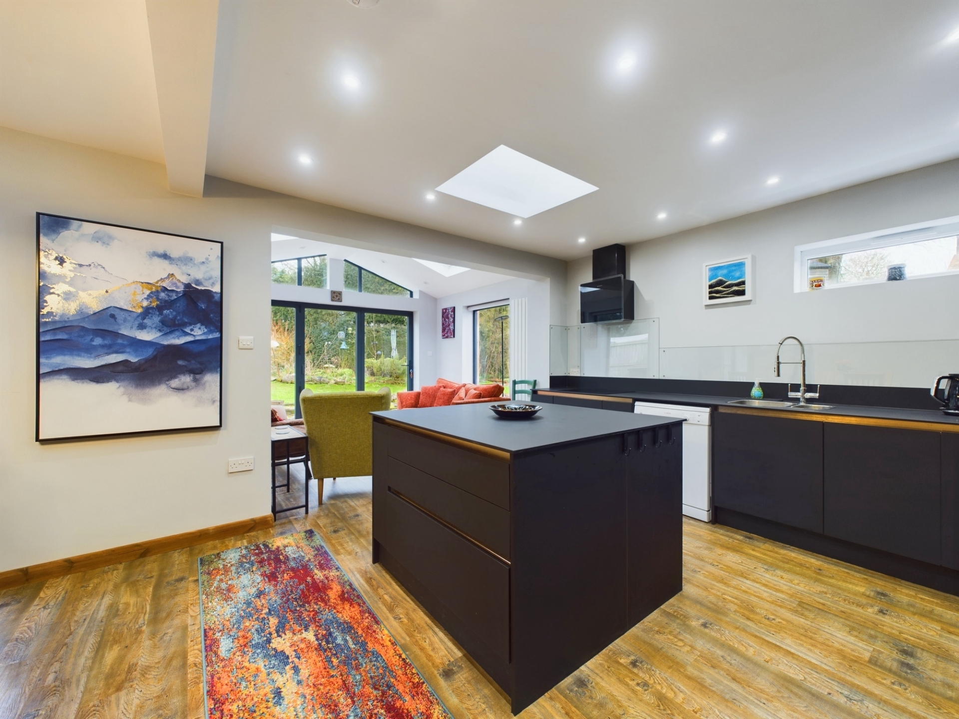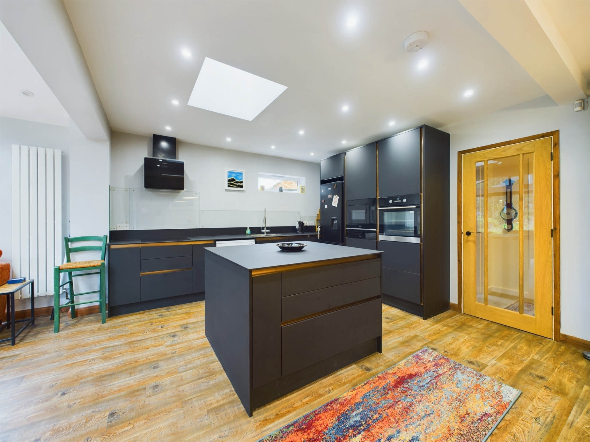 uPVC double glazed windows to side profiles and bi-fold doors to rear elevation. uPVC double glazed window to side elevation. Four Velux windows. Two wall mounted decorative radiators & double radiator. A range of wall and base units with Solid FENIX work surfaces. Integrated oven and microwave. Space for white goods. Stainless steel sink with stainless steel mixer tap. Splash back panels to splash areas. Ceramic hob, extractor fan and central island unit. ,